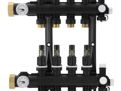 EP heating manifold assemblies feature isolation valves and balancing valves with flow meters, and come fully assembled, ready for installation. The manifolds are available in 2- through 8-loop configurations with a maximum flow of 15.4 gpm. The body ends feature R32 unions and the loop outlets have R20 male threads. The manifold mounts on a bracket (A2670006) that comes with the assembly.
