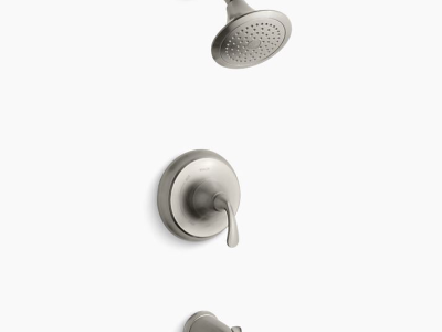 Kohler® Bath/Shower Valve Trim, Sculpted, Forte® Rite-Temp®, 2.5 gpm Shower Flow Rate, Diverter Spout, 5-1/4 in Spout Reach, 1 Handles, Lever, 6-3/8 in Dia x 5 in D Trim, Hand Shower Yes/No: No, Spray Pattern: Rain, 1 Spray Functions, 80 psi, Wall Mount, Metal, Vibrant® Brushed Nickel