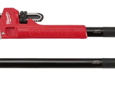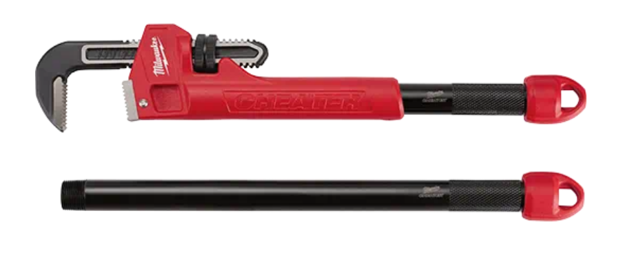 The Milwaukee Cheater Adaptable Pipe Wrench features a new to the world 3 length design which delivers maximum productivity to the professional user. The Cheater Adaptable Pipe Wrench comes with 2 interchangeable threaded fit handles offering the versatility of 10 inch length when used with no handle for tight spaces, 18 inch length with the small handle for general purpose use, and 24 inch length with the long handle for maximum leverage and reach. The Cheater Adaptable Pipe Wrench features an overbite jaw design offering the largest gripping surface. Dual coil springs offer maximum durability and tool life, and the ergonomic handle form has been designed for maximum comfort and won't dig into the palms. Through hardened jaws deliver increased grip and tooth durability, and tether ready handle loops makes the Milwaukee Cheater perfect for the toughest jobsites.
