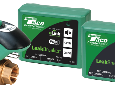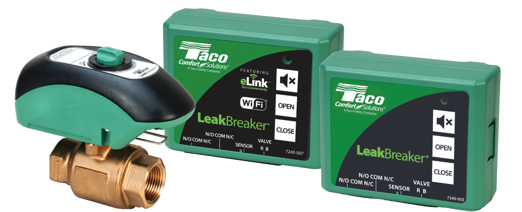 The Taco LeakBreaker is a water heater leak protection device that protects against flood damage from the containment failure of a water heater. It consists of a control unit, valve with actuator and sensor. This resettable, testable protection device can be installed on any style water heater to shut off the incoming water supply, preventing additional water flow to a damaged water heater. The multi-color LED light and audible alarm lets you know the status of LeakBreaker at all times.