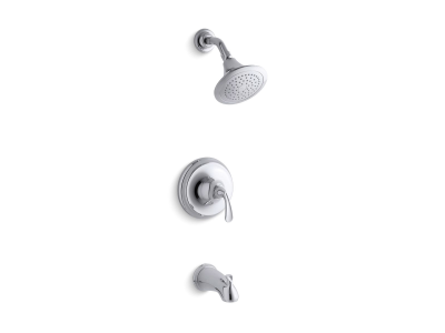 Kohler® Bath/Shower Valve Trim, Sculpted, Forte® Rite-Temp®, 2.5 gpm Shower Flow Rate, Diverter Spout, 5-1/4 in Spout Reach, 1 Handles, Lever, 6-3/8 in Dia x 5 in D Trim, Hand Shower Yes/No: No, Spray Pattern: Rain, 1 Spray Functions, 80 psi, Wall Mount, Metal, Polished Chrome