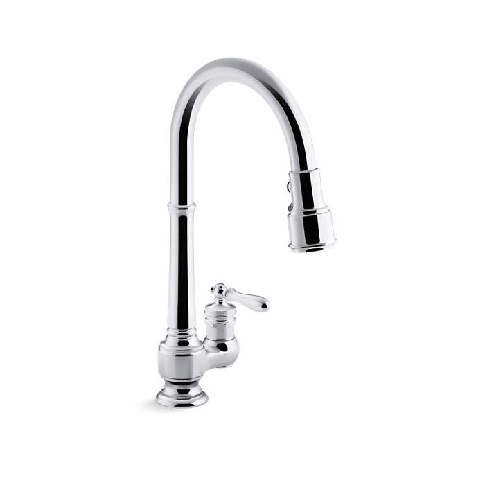Kohler®, 99260-CP, Kitchen Sink Faucet, Artifacts® Collection, 1.5 gpm Flow Rate, High Arc Pull-Down Spout, 17-5/8 in Spout Reach, 17-5/8 in Spout Height, Lever Handle, 1 Handles, 1 Faucet Holes, 3/8 in Connection, Compression Connection, Function: Traditional, 3 Spray Functions, 2-1/2 in Maximum Deck Thickness, Deck Mounting, Ceramic Disc, Metal, Polished Chrome