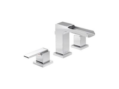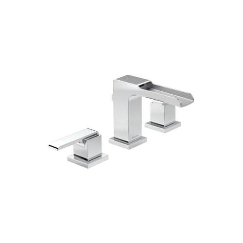 DELTA® Widespread Lavatory Faucet, Ara® Collection, 1.5 gpm Flow Rate, 4 to 16 in Center Distance, Channel Spout, 6-1/8 in Spout Reach, 4-1/2 in Spout Height, 32 in L Hose, Lever Handle, 2 Handles, Pop-Up Drain, 3 Faucet Holes, 3/8 in Connection, Compression Connection, 2-1/4 in Maximum Deck Thickness, Deck Mounting, DIAMOND™ Seal Valve, 5-5/16 in H Dimensions, Brass, Polished Chrome, Commercial Commercial/Residential