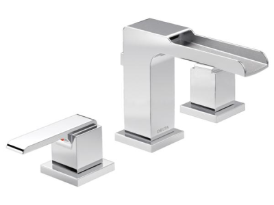 DELTA® 3568LF-MPU Ara® Widespread Lavatory Faucet, Commercial, 1.5 gpm Flow Rate, 4-1/2 in H Spout, 4 to 16 in Center, Polished Chrome, 2 Handles, Pop-Up Drain