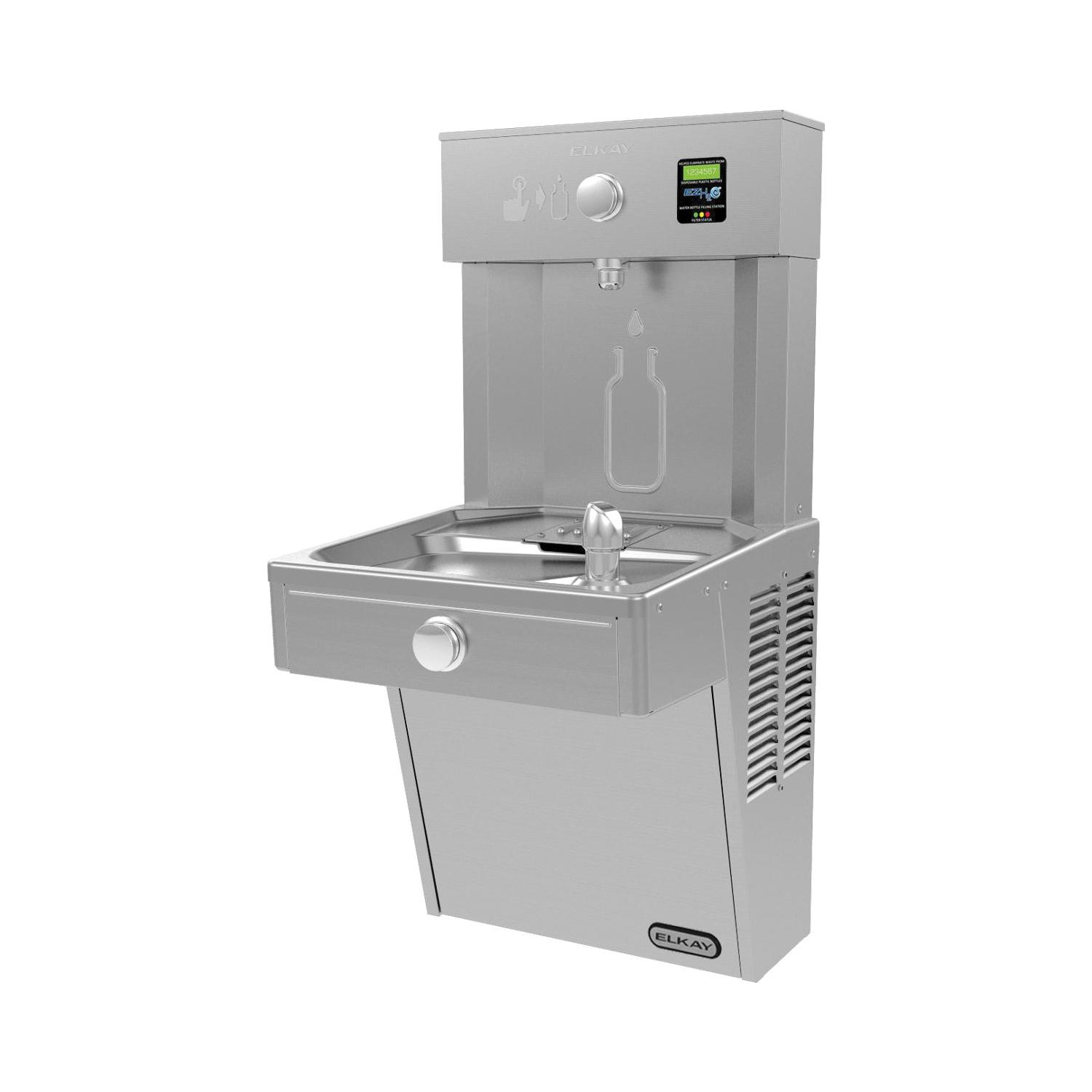 Elkay® Bottle Filling Station and Cooler, Lead Free Filtered, 1.1 gpm, Operation: Push Button, Chilling Option: Refrigerated, 1-1/4 in Drain, Wall Mount, 115 V AC 60 Hz 370 W, R-134A Refrigerant, Galvanized Steel, Stainless Steel, 18-5/8 in D, Domestic