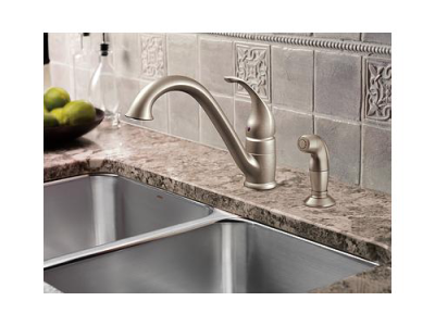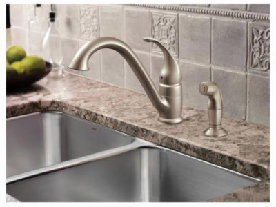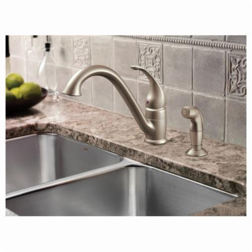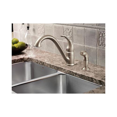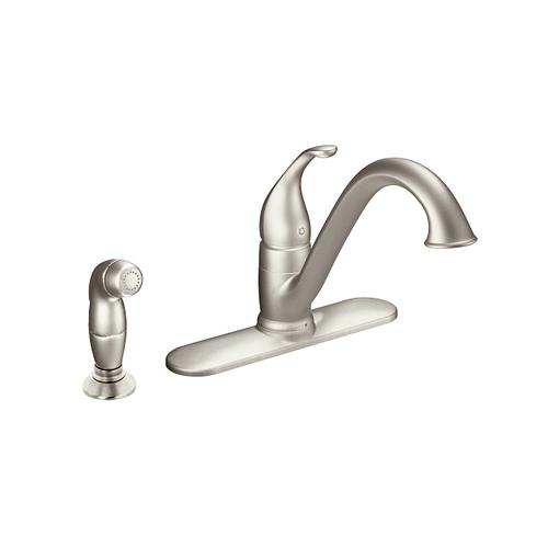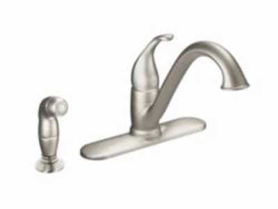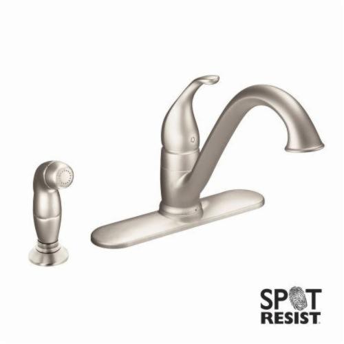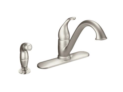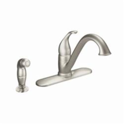 Moen®, 7840SRS, Kitchen Faucet, Camerist® Collection, 1.5 gpm Flow Rate, Low-Arc Spout, 9-1/4 in Spout Reach, 6-1/8 in Spout Height, Lever Handle, 1 Handles, Side Spray(Y/N): Yes, 2 Faucet Holes, 1-1/4 in Faucet Hole, 3/8 in Connection, Compression Connection, Spray Pattern: Aerator Stream, 1-1/8 in Maximum Deck Thickness, Deck Mounting, 1255™ Duralast™ Cartridge, 10.25 in W x 9.25 in D x 8.13 in H Dimensions, Metal, Spot Resist Stainless, Domestic