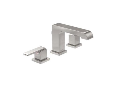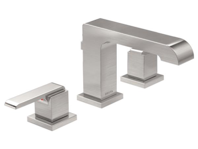 DELTA® Widespread Lavatory Faucet, Ara® Collection, 1.5 gpm Flow Rate, 4 to 16 in Center Distance, Standard Spout, 6-3/4 in Spout Reach, 4-5/8 in Spout Height, Lever Handle, 2 Handles, Pop-Up Drain, 3 Faucet Holes, 3/8 in Connection, Compression Connection, 2-1/4 in Maximum Deck Thickness, Deck Mounting, DIAMOND™ Seal Valve, 5-5/16 in H Dimensions, Brass, Stainless Steel, Commercial Commercial/Residential