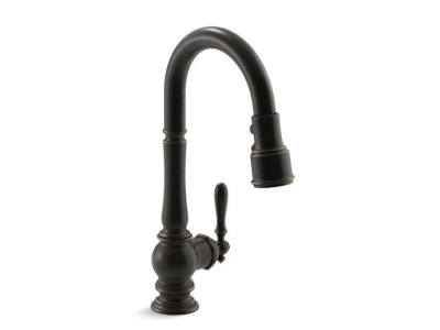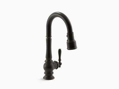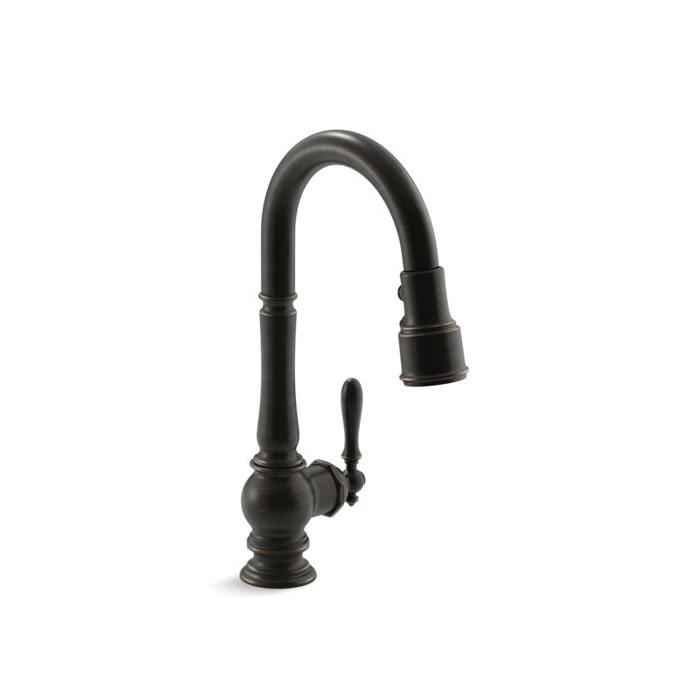 Kohler® Kitchen Sink Faucet, Artifacts®, 1.5 gpm, High-Arc Spout, 7-5/8 in Spout Reach, 16 in Spout Height, Turned Lever, 1 Handles, 1 Faucet Holes, 3/8 in, Compression, Spray Pattern: Pull-Out, Function: Traditional, 3-1/4 in Maximum Deck Thickness, Deck Mount, Ceramic Disc Valve/Cartridge, 7-5/8 in L x 2-5/8 in W x 16 in H, Metal, Oil Rubbed Bronze