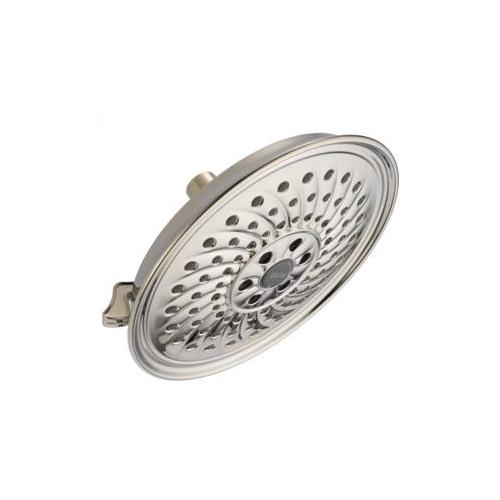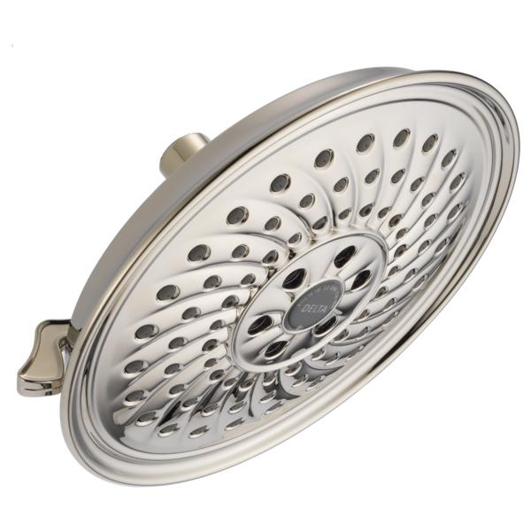 DELTA® Raincan Shower Head, 3-Setting, 2 gpm Flow Rate, 1/2 in IPS Connection, Round Shape, 3 Sprays, Spray Pattern: Full Body/H2Okinetic®/Pause, 80 psi Pressure, 8-1/4 in Dia Head, 3-1/2 in Overall Height, ABS, Brilliance® Polished Nickel, Import