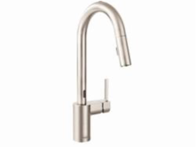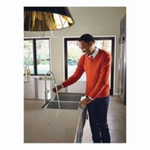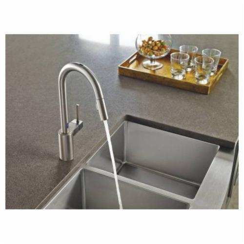 Moen® Kitchen Faucet, Pull-Down, Series: 7565E, Align™ Collection, 1.5 gpm Flow Rate, High Arc Pull-Down Spout, 7.53 in Spout Reach, 15.7 in Spout Height, 68 in Hose, Lever Handle, 1 Handles, 1/3 Faucet Holes, 1-1/2 in Faucet Hole, 3/8 in Connection, Compression Connection, Spray Pattern: Aerated Stream, Function: Traditional, 2 Spray Functions, 2-1/2 in Maximum Deck Thickness, Deck Mounting, 1255 Duralast® Ceramic Disc, 14.25 in W x 12.25 in D x 15.63 in H, Metal, Spot Resist® Stainless Steel, Domestic