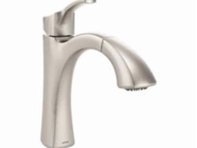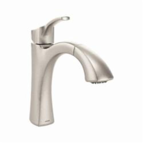Moen® Kitchen Faucet, Voss™, Pull-Out Spout, 9.39 in Spout Reach, 12.3 in Spout Height, 68 in Hose, Lever, 1 Handle, No Side Spray(Y/N), 1 Faucet Hole, 1-1/2 in Faucet Hole, 3/8 in, Compression, Spray Pattern: Aerated Stream, 2 Spray Functions, 2-1/2 in Maximum Deck Thickness, Deck Mount, 1255 Duralast® Ceramic Disc Valve/Cartridge, 12-1/4 in W x 3-1/2 in D x 12-1/4 in H, Metal, Spot Resist® Stainless Steel, Domestic