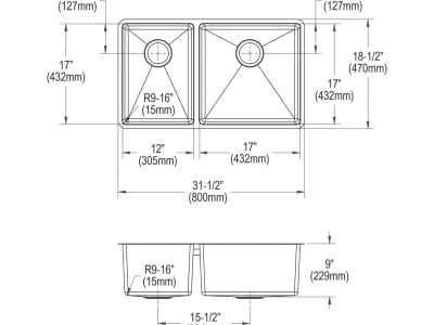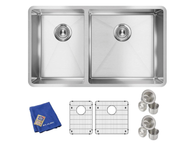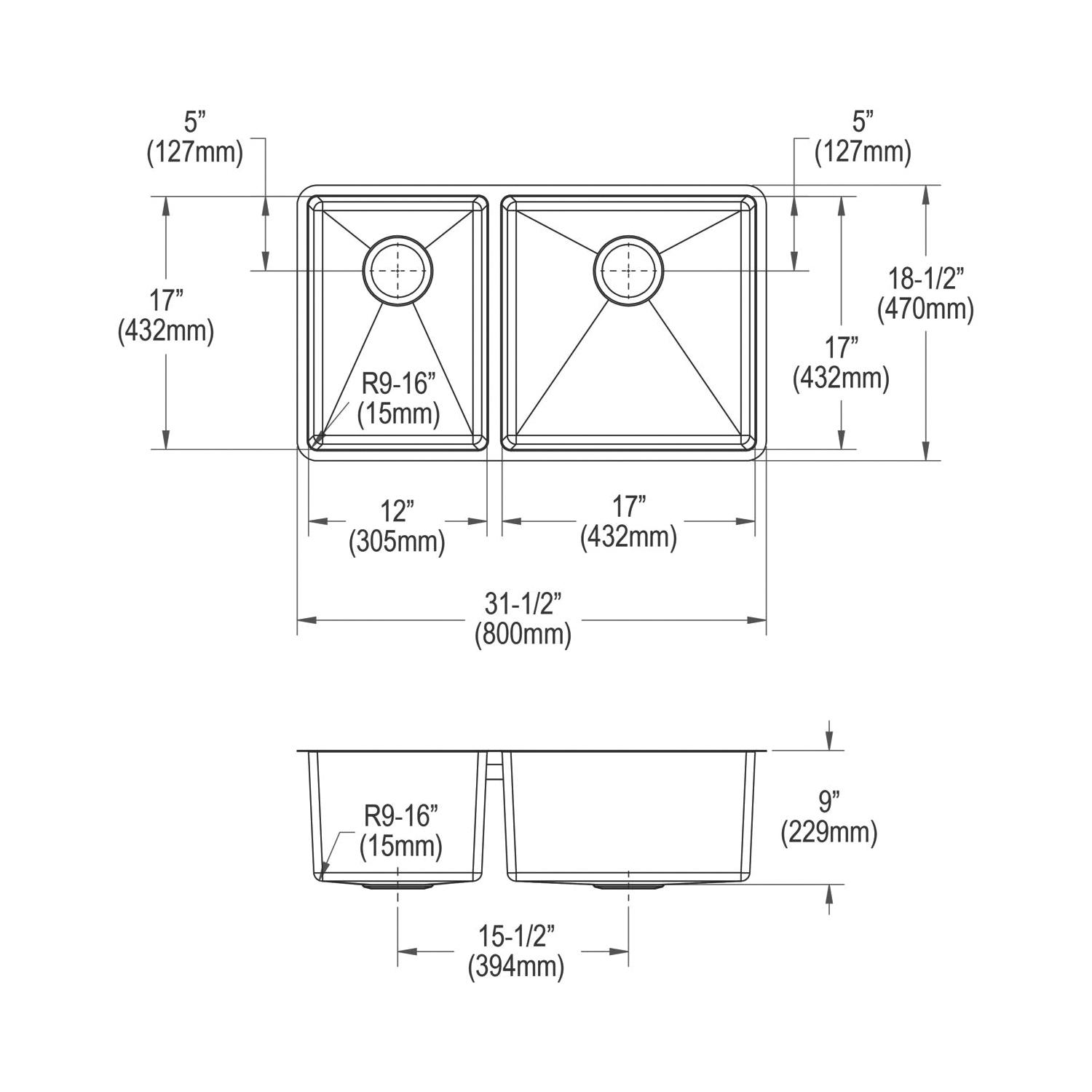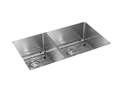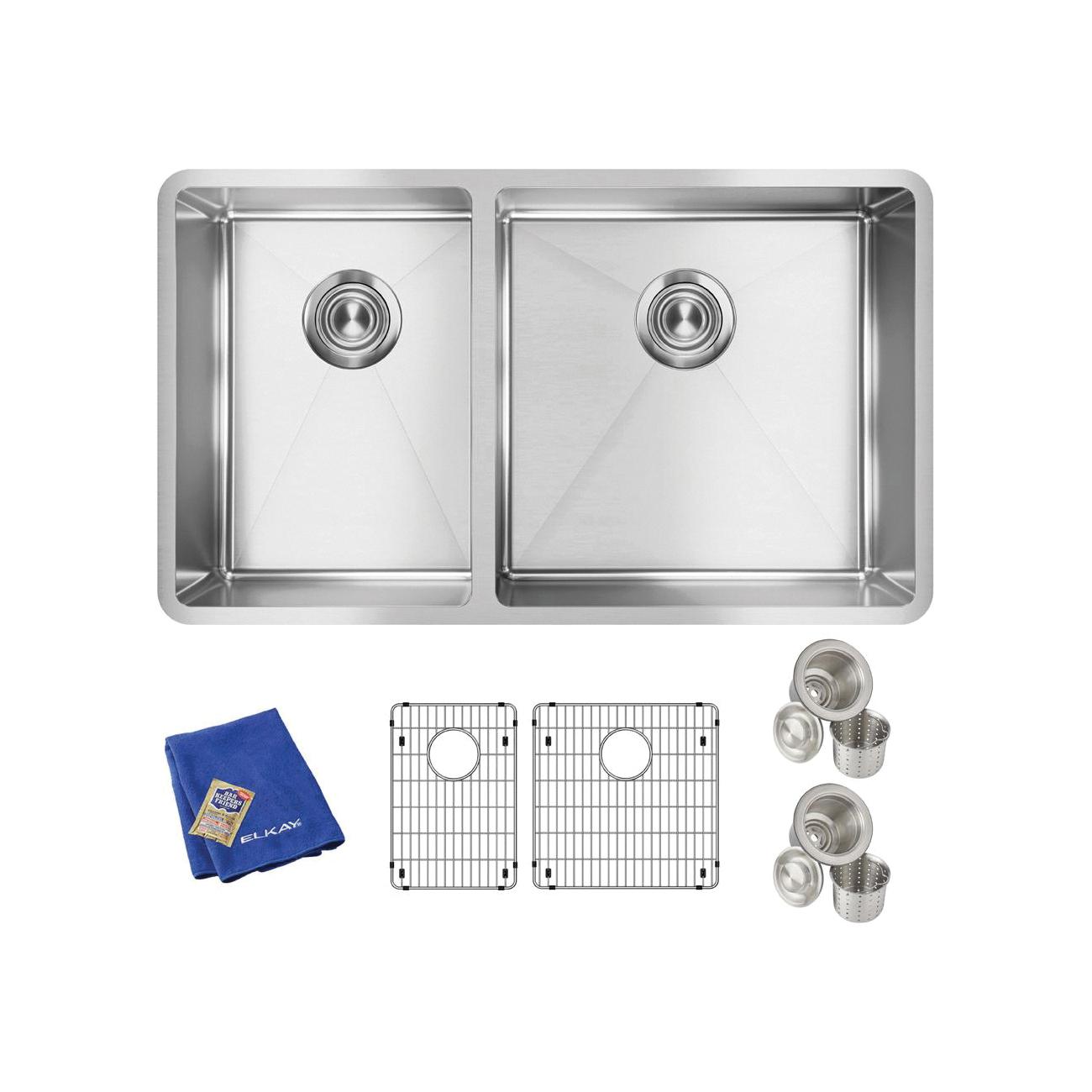 Elkay®, ECTRU32179LTC, Kitchen Sink Kit, Transitional, Crosstown® Collection, Rectangle Shape, 12 in Left, 17 in Right Bowl Length, 17 in Left, 17 in Right Bowl Width, 9 in Left, 9 in Right Bowl Depth, 3-1/2 in Drain Opening, 2 Bowls, 31-1/2 in L x 18-1/2 in W x 9 in H Overall, Undermount Mounting, 18 ga 304 Stainless Steel, Polished Satin, Import