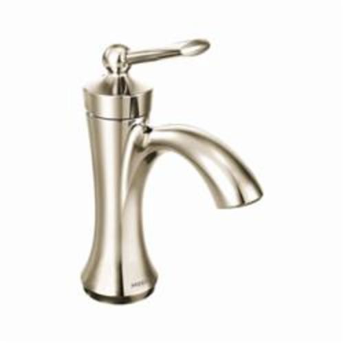 Moen® Bathroom Faucet, Wynford™, 1.5 gpm, Fixed Spout, 4.63 in Spout Reach, 5 in Spout Height, Lever, 1 Handle, Pop-Up Drain, 1 Faucet Hole, 3/8 in, Compression, Function: Traditional, 2-1/2 in Maximum Deck Thickness, Deck Mount, 1255 Duralast® Ceramic Disc Valve/Cartridge, 2.5 in W x 5 in D x 5.63 in H, Metal, Polished Nickel, Domestic