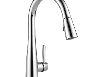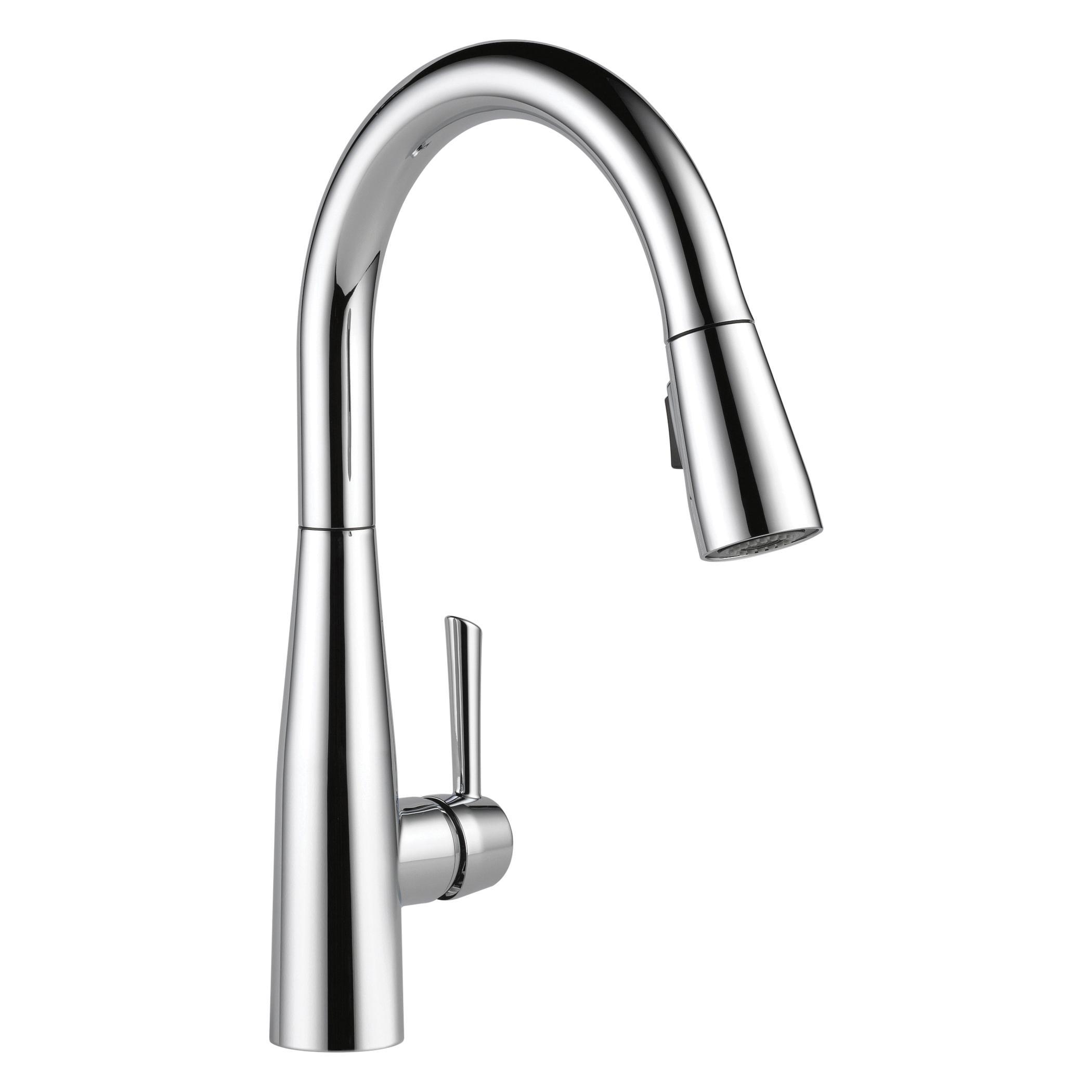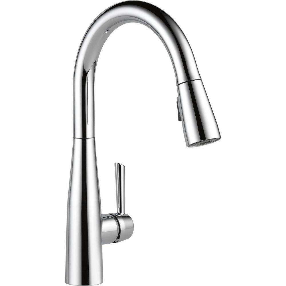 DELTA® Kitchen Faucet, Essa® Collection, 1.8 gpm Flow Rate, 8 in Center Distance, Pull-Down Spout, 9-3/8 in Spout Reach, 15-3/4 in Spout Height, Lever Handle, 1 Handles, 1 Faucet Holes, 1-1/4 in Faucet Hole, 3/8 in Connection, Compression Connection, Spray Pattern: Aerated Stream/Full Body, Function: Traditional, 2 Spray Functions, 3 in Maximum Deck Thickness, Deck Mounting, Euro-Motion DIAMOND™ Seal Valve, 4-1/4 in W x 9-3/8 in D x 15-3/4 in H, Metal, Polished Chrome, Commercial Commercial/Residential