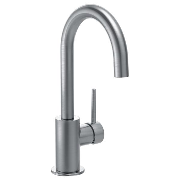 DELTA® Bar/Prep Faucet, Trinsic® Collection, 1.5 gpm Flow Rate, Swivel Spout, 5-15/16 in Spout Reach, 11-1/2 in Spout Height, Lever Handle, 1 Handles, 1 Faucet Holes, 1-1/2 in Faucet Hole, 1/2 in Connection, Spray Pattern: Aerated Stream, 1 Spray Functions, 2-1/2 in Maximum Deck Thickness, Deck Mounting, Ceramic Disc, 3-7/16 in W x 5-15/16 in D x 11-1/2 in H Dimensions, Brass, Arctic™ Stainless Steel, Import