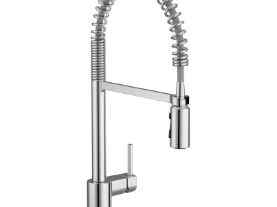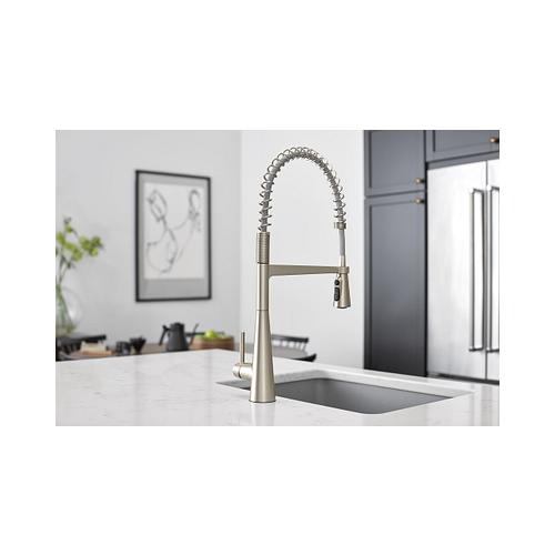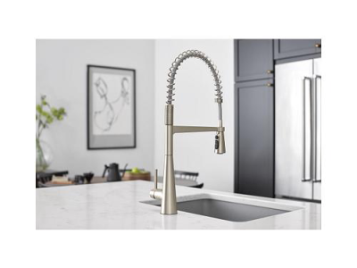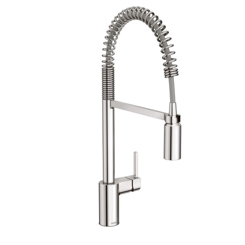 Bring the performance and style of a professional faucet to your kitchen with the Moen Align Spring Pulldown Kitchen Faucet. This spring faucet greatly expands your reach with its ultra-flexible hose. Boost the performance of your kitchen faucet with the push of a button. Power Boost fills containers faster and provides 50% more spray power, for quicker clean-up. Moen's game-changing Power Boost innovation helps maximize your time at the sink, offering improved functionality at your fingertips. With its dramatic, industrial aesthetic and mirror-like chrome finish, this stylish faucet is an eye-catching focal point. This single-hole faucet is compatible with a wide variety of sinks, and it features a convenient Duralock quick connect system that makes installation quick and easy.