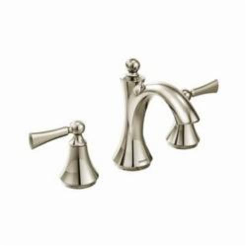 Moen® Widespread Bathroom Faucet Trim, Wynford™ Collection, 1.2 gpm Flow Rate, 8 to 16 in Center Distance, Fixed Spout, 4-5/8 in Spout Reach, 4-3/8 in Spout Height, Lever Handle, 2 Handles, Pop-Up Drain, 3 Faucet Holes, 1/2 in Connection, IPS Connection, 1-1/4 in Maximum Deck Thickness, Deck Mounting, 1224 Ceramic Disc Cartridge, 13.63 in W x 4.63 in D x 6.63 in H Dimensions, Metal, Polished Nickel, Import
