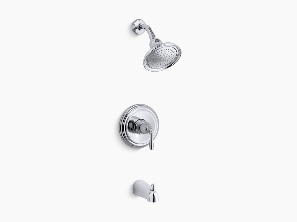 Designed to capture the essence of a bygone era, Devonshire® faucets and accessories bring a versatile, traditional style to the bathroom. This bath and shower trim includes a showerhead with Katalyst™ air-induction spray. By infusing two liters of air per minute, Katalyst™ delivers a powerful, voluptuous spray that clings to the body with larger, fuller water drops. Pair this trim with a Rite-Temp® pressure-balancing valve, which maintains your desired water temperature during pressure fluctuations.