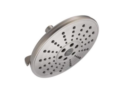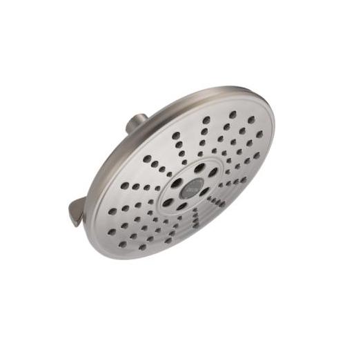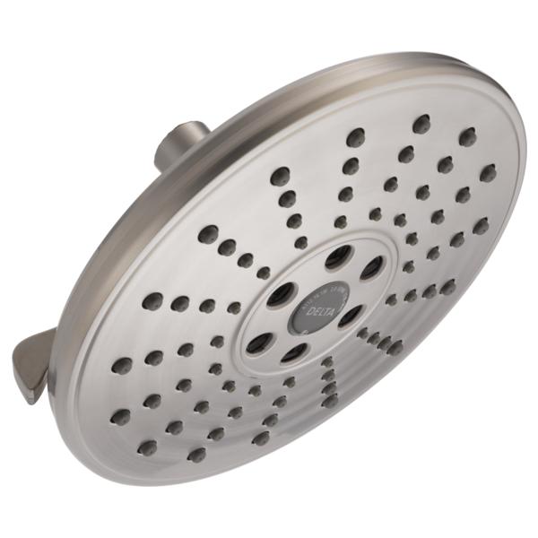 DELTA® Showerhead, Universal, 1.75 gpm Maximum, 1/2 in Connection, Round Shape, 3 Sprays, Spray Pattern: H2Okinetic® PowerDrench®/Full Body/Pause, 80 psi Pressure, 7-11/16 in Dia x 3-7/16 in H Head, 7.69 in Overall Length, 7.69 in Overall Width, 3.44 in Overall Height, Plastic, Lumicoat™ Stainless, Import