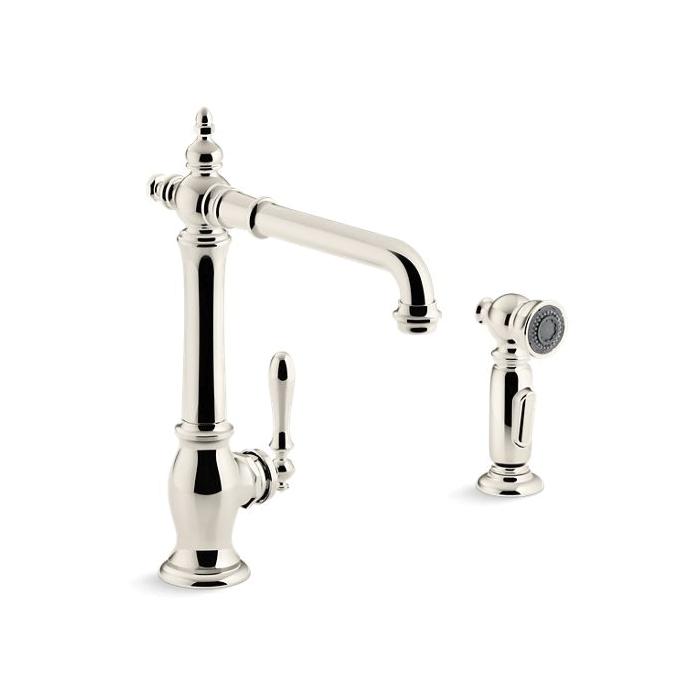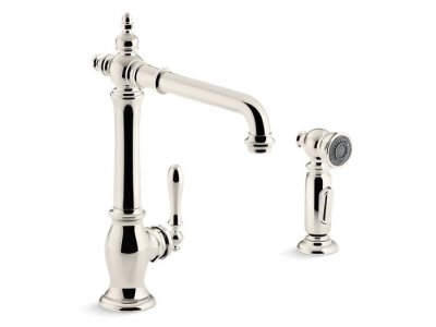 Kohler® Kitchen Sink Faucet, Artifacts® Collection, 1.8 gpm Flow Rate, High-Arc Swivel Spout, 8-1/2 in Spout Reach, 9 in Spout Height, Lever Handle, 1 Handles, Side Spray(Y/N): Yes, 2 Faucet Holes, 3/8 in Connection, Compression Connection, 2 Spray Functions, 3-1/4 in Maximum Deck Thickness, Deck Mounting, Ceramic Disc, 13-1/2 in H, Metal, Vibrant® Polished Nickel