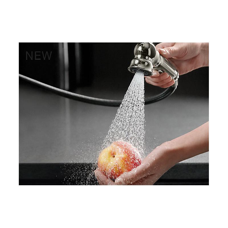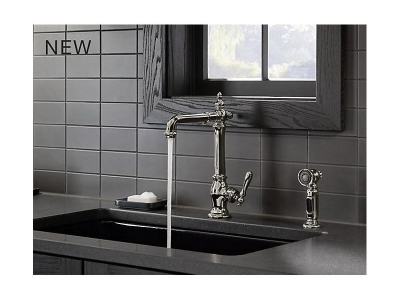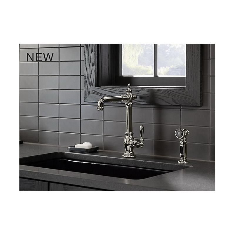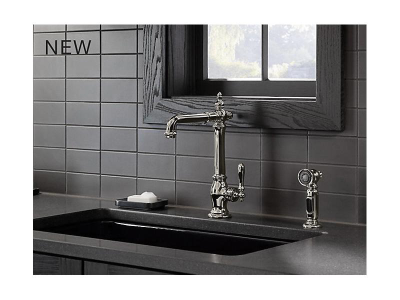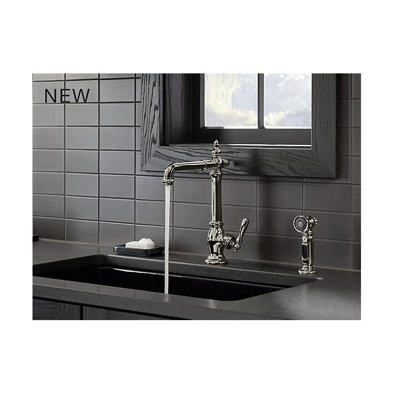 The KOHLER® Artifacts faucet collection brings you classic designs reimagined in fresh new ways for various task areas of the kitchen. This Victorian-inspired deck-mount kitchen sink faucet features an elegant column design with convenient swing spout. The matched side spray lets you switch between BerrySoft spray for food prep and Sweep spray for cleaning.