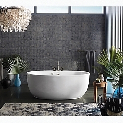 Surround yourself with tranquility and comfort in the KOHLER® Sunstruck freestanding bath. The oval, ergonomic design supports your body for a deep, relaxing soak as the Bask heated surface warms your back, shoulders, and neck with adjustable temperature settings. With its gracefully shaped lines and fluted shroud, this versatile 65-1/2" x 35-1/2" oval freestanding bath complements a wide range of bathroom styles and offers easy three-step installation.