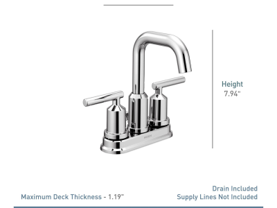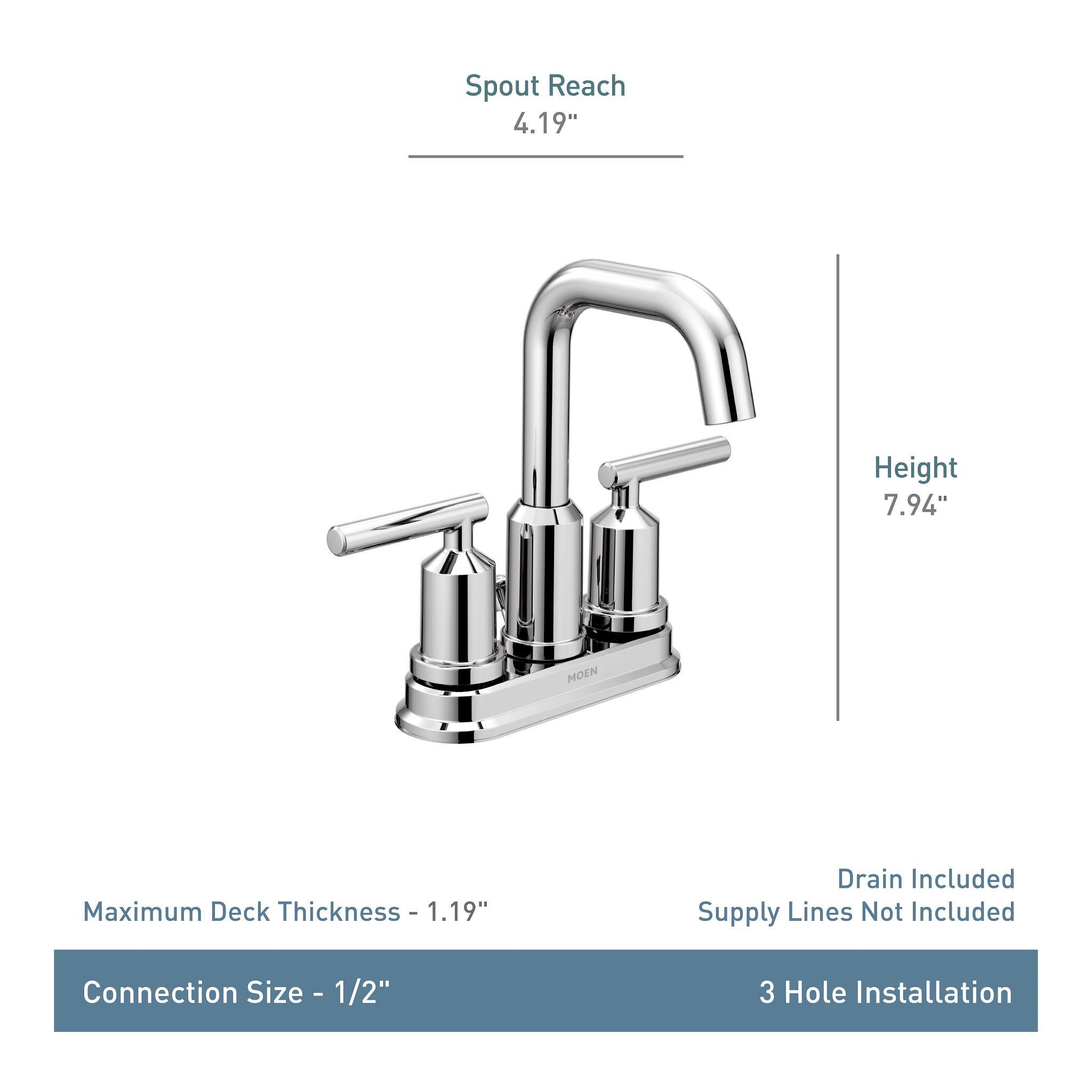 Moen® Centerset Bathroom Faucet, Gibson™ Collection, 1.2 gpm Flow Rate, 4 in Center Distance, High-Arc Rotating Spout, 4-3/16 in Spout Reach, 7-15/16 in Spout Height, Lever Handle, 2 Handles, Metal Pop-Up Drain, 3 Faucet Holes, 1/2 in Connection, IPS Connection, Spray Pattern: Aerated, 1-3/16 in Maximum Deck Thickness, Deck Mounting, Ceramic Disc, 6.5 in W x 5 in D x 7.95 in H, Metal, Polished Chrome, Domestic