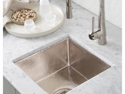This bar Sink embraces simplistic splendor. With its square design and undermount style, the Cantina is eye-catching, space-conscious and functional. Hand-hammered and forged of high-quality recycled copper, each piece displays a one-of-a-kind character. Simply rinse with mild soap and water to preserve the Cantina's living finish.