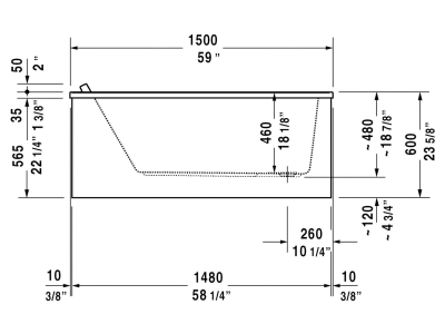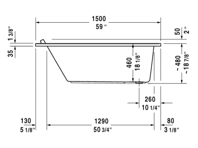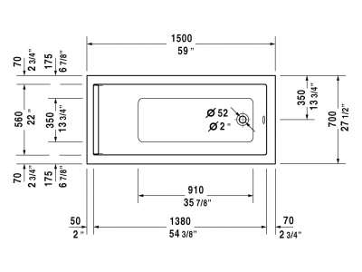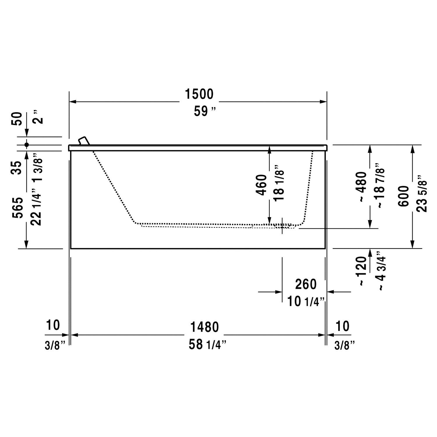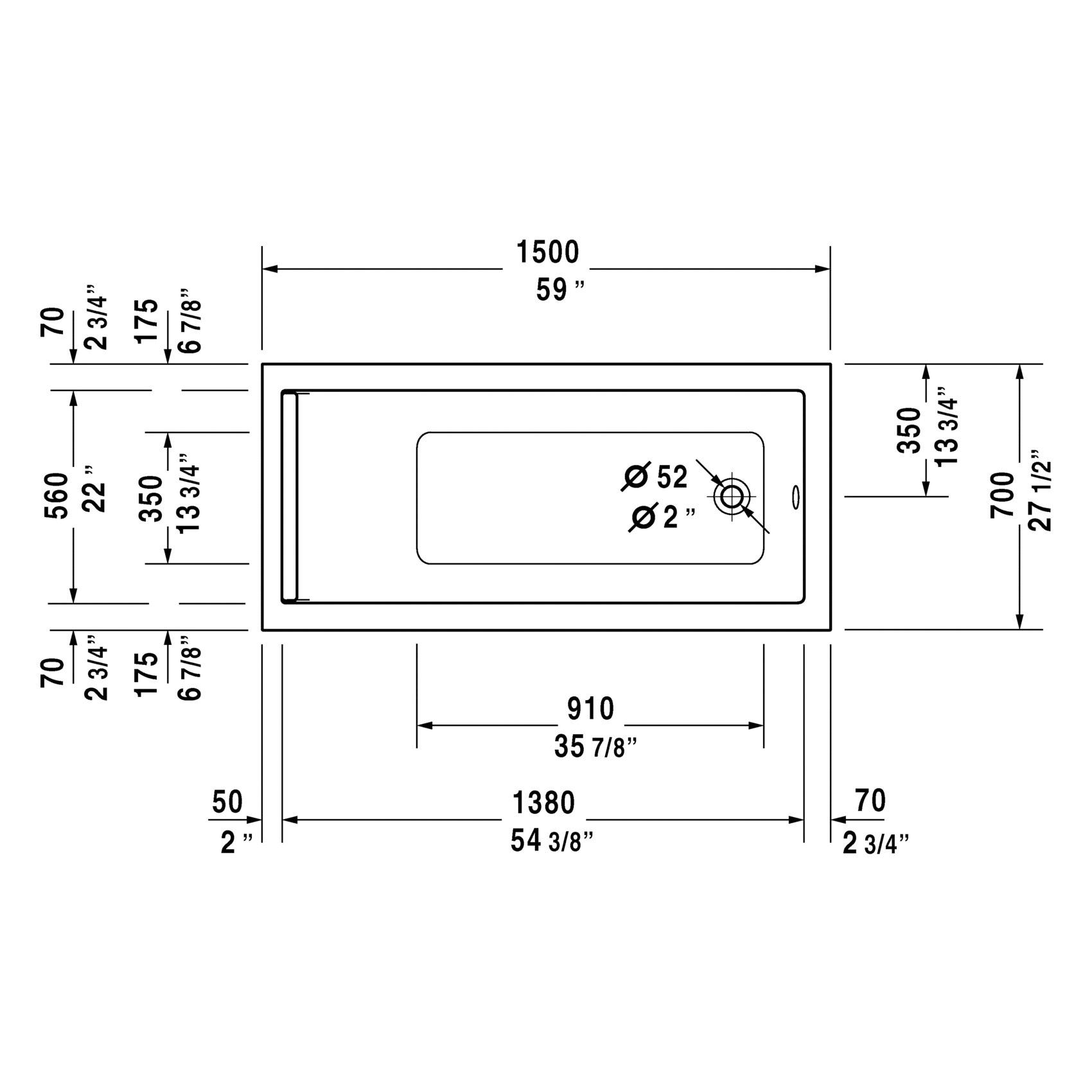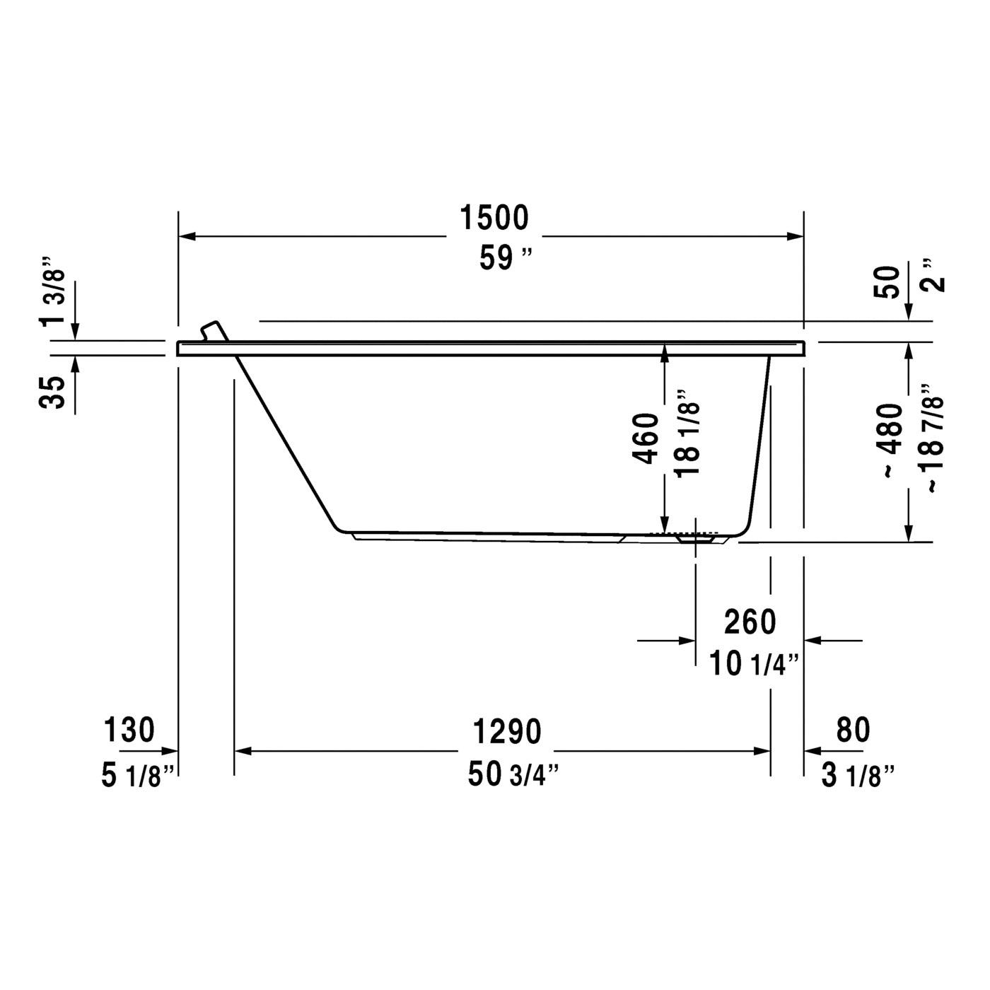 DURAVIT Bathtub, Series: 700331, Starck Collection, Soaking Bath Therapy, Rectangle Shape, 59 in Length, 27-1/2 in Width, 18-1/8 in Height, 18-1/8 in Tub Depth, 52.123 gal Water, Right Drain Location, 2 in Dia Drain, 35-7/8 in L x 13-3/4 in W Bathing Well, 54-3/8 in L x 22 in W Opening, Drop-In Mounting, Acrylic, White, Domestic/Import: Import