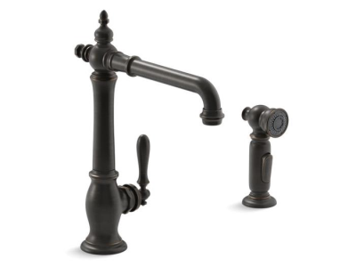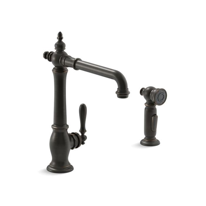 Kohler® Kitchen Sink Faucet, Artifacts® Collection, 1.5 gpm Flow Rate, High-Arc Swivel Spout, 8-1/2 in Spout Reach, 9 in Spout Height, Lever Handle, 1 Handles, Side Spray(Y/N): Yes, 2 Faucet Holes, 3/8 in Connection, Compression Connection, 2 Spray Functions, 3-1/4 in Maximum Deck Thickness, Deck Mounting, Ceramic Disc, 13-1/2 in H, Metal, Oil Rubbed Bronze
