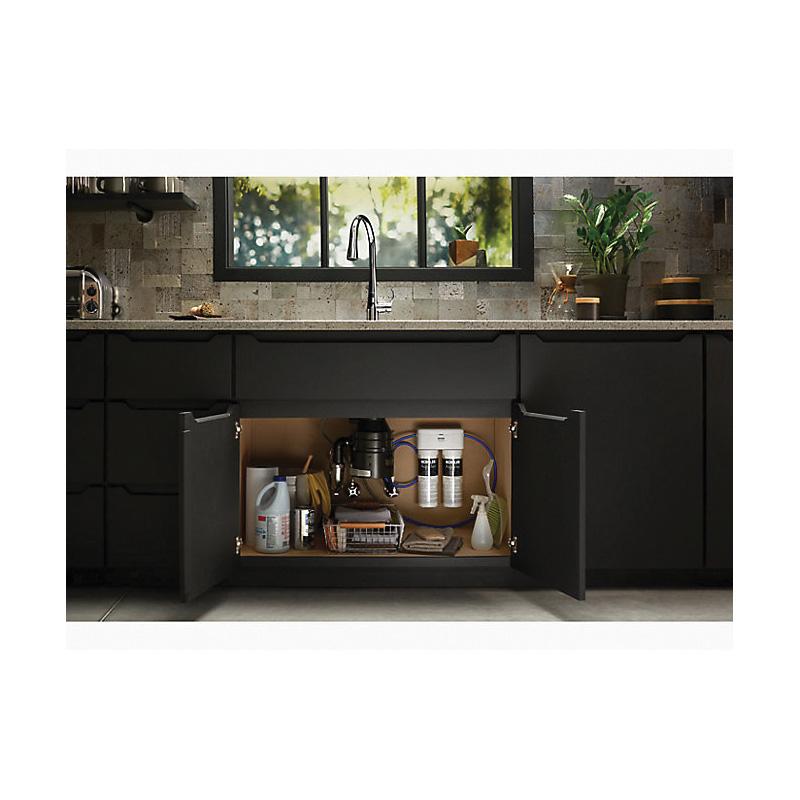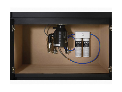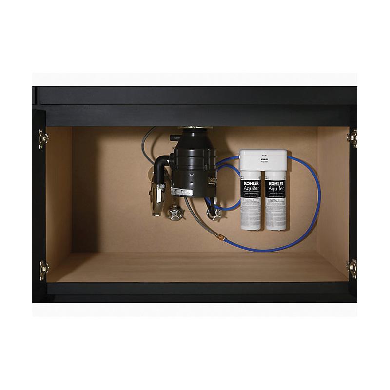 Enjoy greater peace of mind about the water you drink at home. The KOHLER® Aquifer double-cartridge water filtration system effectively reduces contaminants including lead, mercury, chlorine, and pharmaceuticals in your cold water-without compromising your faucet's performance. While many other systems use coal-based media filters, the Aquifer filter uses ground coconut shells, making it more eco-friendly. Under-sink installation is fast and easy, and the compact Aquifer system fits alongside garbage disposals and household items stored below the sink.