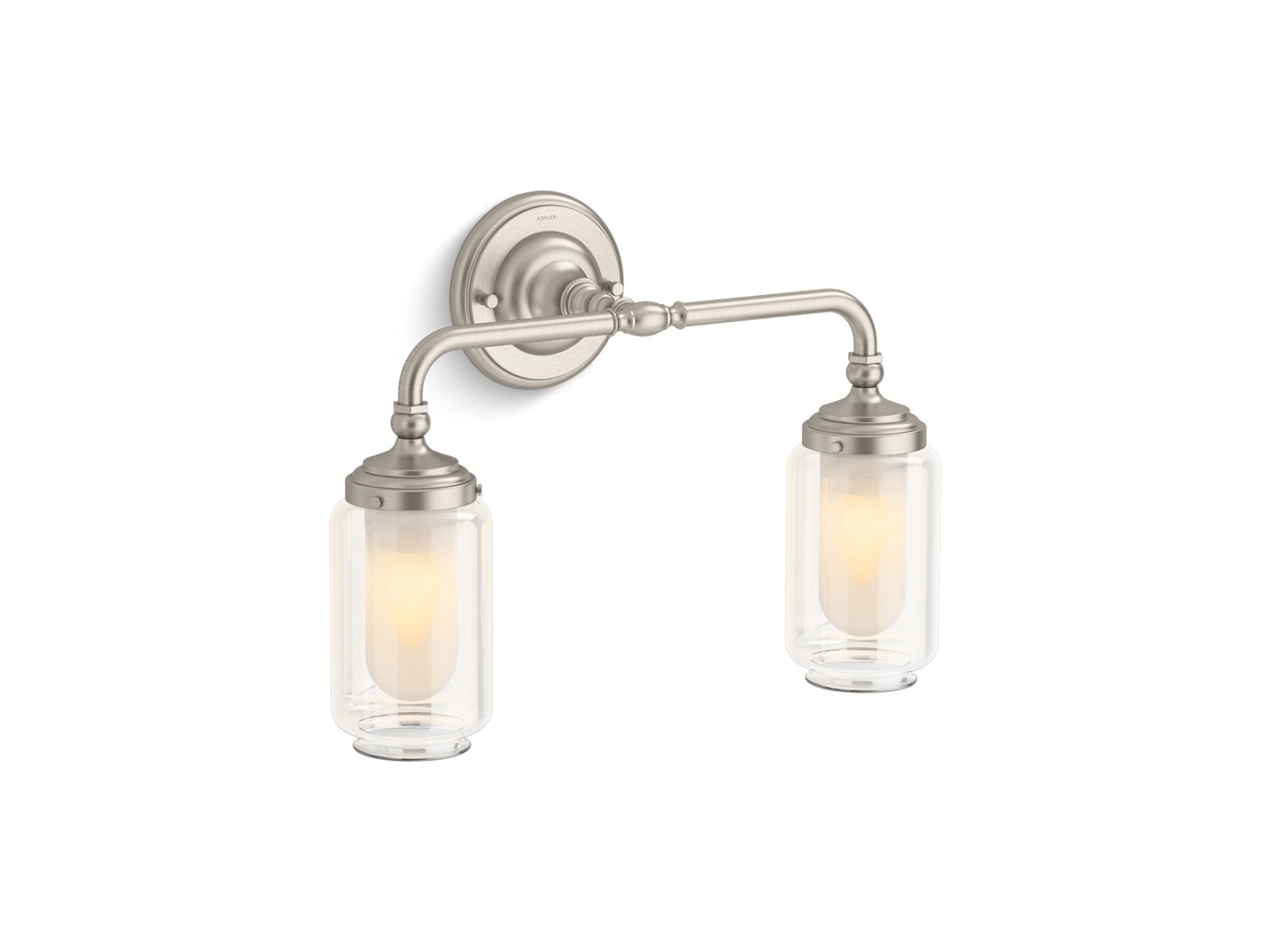 Kohler®, 72582-BNL, Light Sconce, Series: 72582, Artifacts Collection, Incandescent Lamp, 60 W Lamp, E26 Medium Lamp Base, 2 Lamps, Clear Frosted Glass Shade, Wall Mounting, Brass Housing Material, Brushed Nickel Housing Finish, 18-3/16 in L x 7-7/16 in W x 13-1/4 in H Dimensions