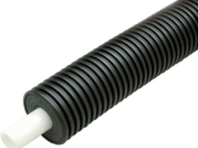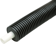 Ecoflex thermal single pipes are designed for fluid transfer in heating and cooling applications. The Wirsbo hePEX service pipe in Ecoflex thermal single piping is manufactured by the Engel-method (PEX-a) process and is listed to ASTM F876 and F877. An oxygen-diffusion barrier extruded onto the service pipe dramatically reduces the amount of oxygen molecules that can migrate through the tubing wall. This oxygen-diffusion barrier protects ferrous components within the fluid pathway from corrosion. The pipe is surrounded by multi-layer, closed-cell, PEX-foam insulation and a water-resistant, corrugated HDPE jacket, making it ideal for direct-burial applications.