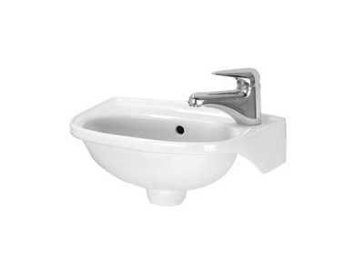 This stylishly designed diminutive basin, in keeping with the small scale, has a narrow ledge with a faucet hole punched on the right side.