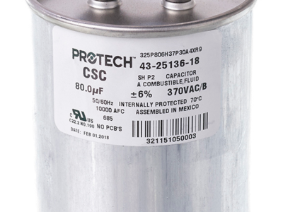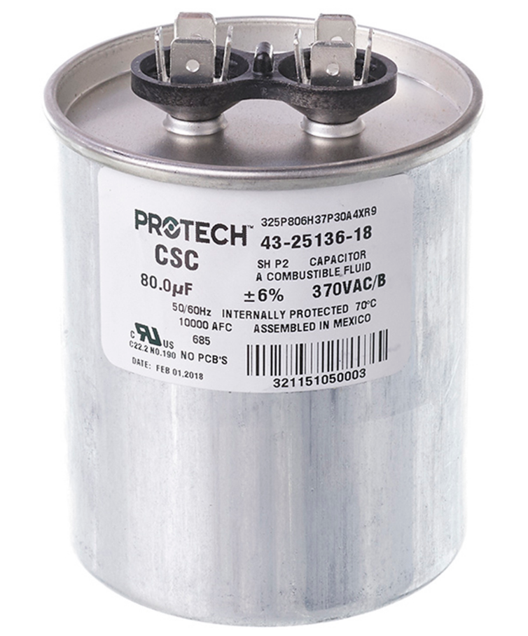 PROTECH™ Capacitor, Single, 80 uF, 370 V AC, Round, 2.62 in Dia x 5.12 in H