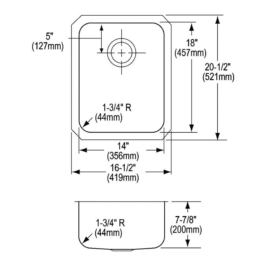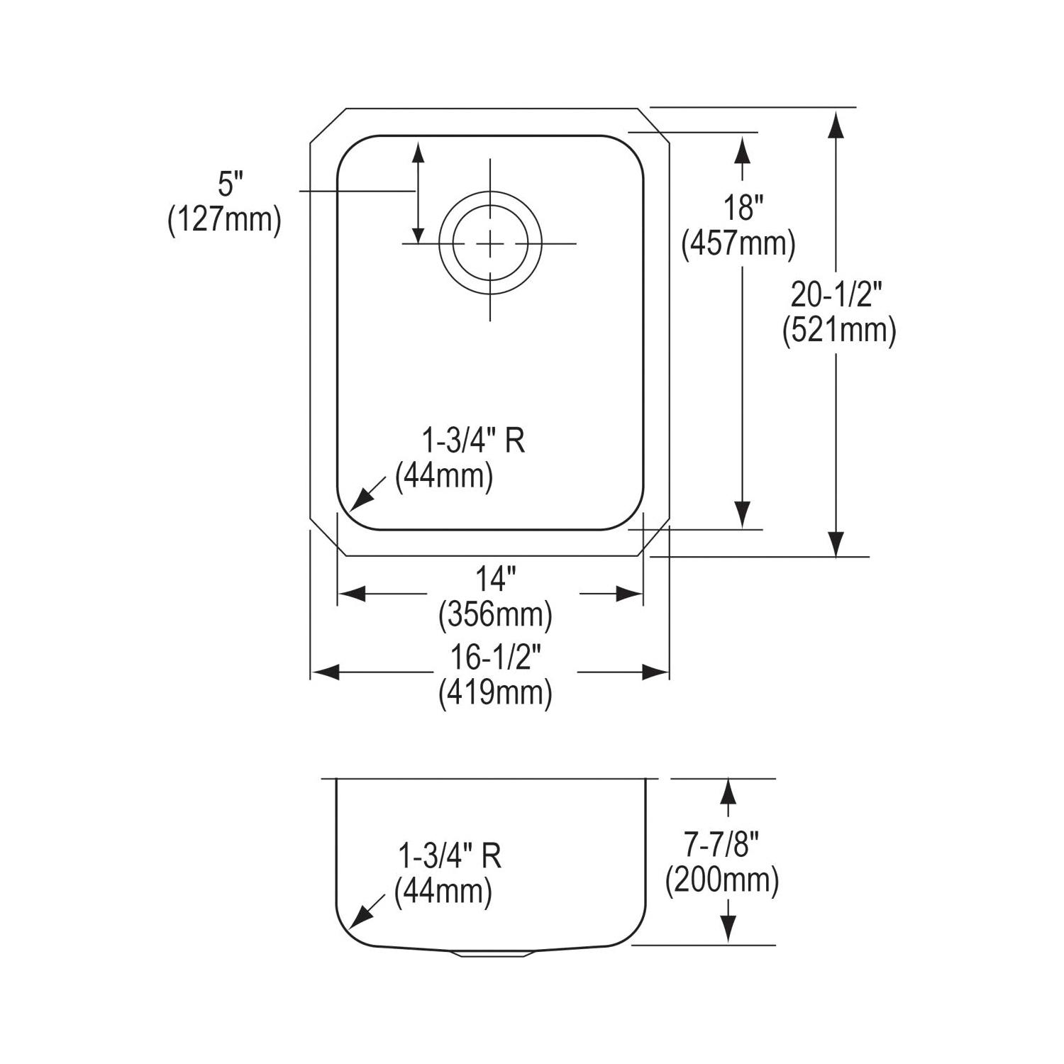 Elkay®, ELUH1418, Kitchen Sink, Lustertone™ Classic Collection, 14 in Bowl Length, 18 in Bowl Width, 7-7/8 in Bowl Depth, 3-1/2 in Drain Opening, 1 Bowls, 16-1/2 in L x 20-1/2 in W x 7-7/8 in H Overall, Undermount Mounting, 18 ga 304 Stainless Steel, Domestic