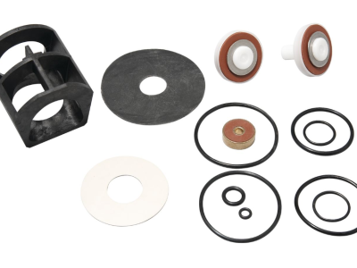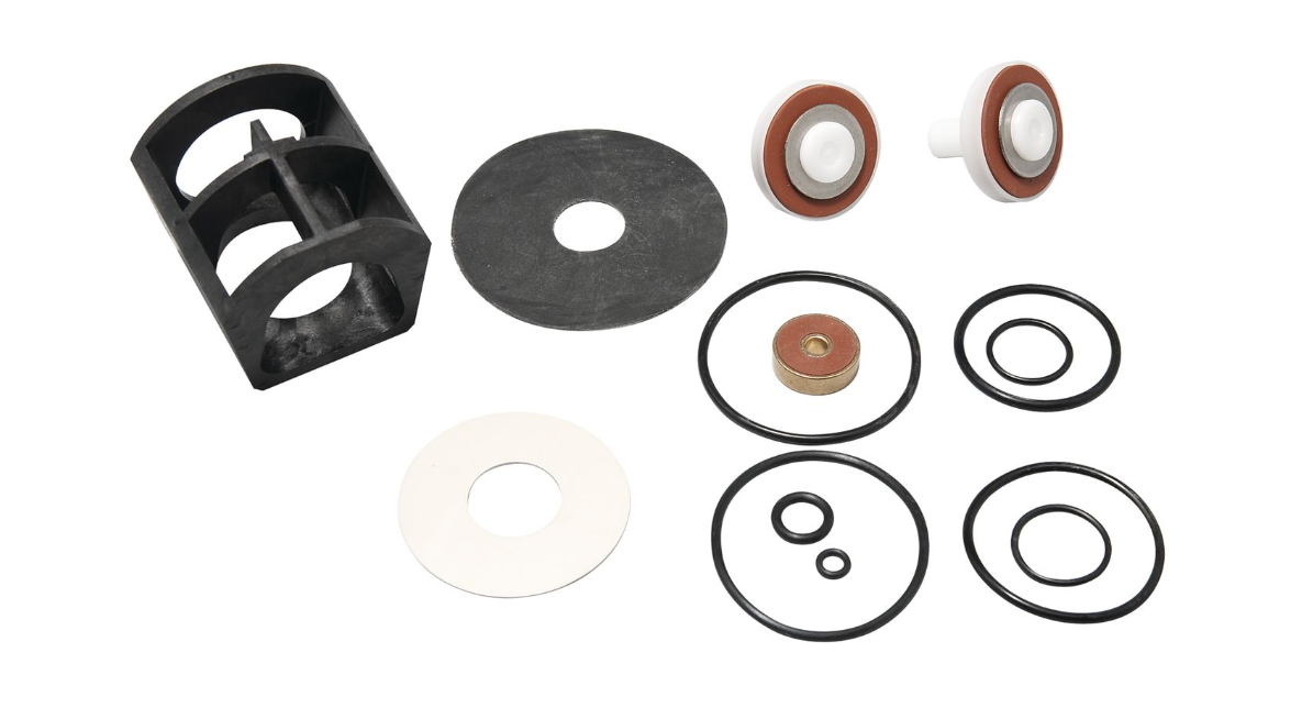 This reduced pressure backflow preventer complete rubber parts kit consists of diaphragm, two disc assemblies, stem o-rings, cover o-ring two seat o-rings and relief valve seat o-ring.