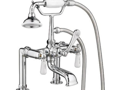 This stylish rim-mounted leg tub faucet has a hand held shower perched upon a wide elephant spout and decorative porcelain lever handles.