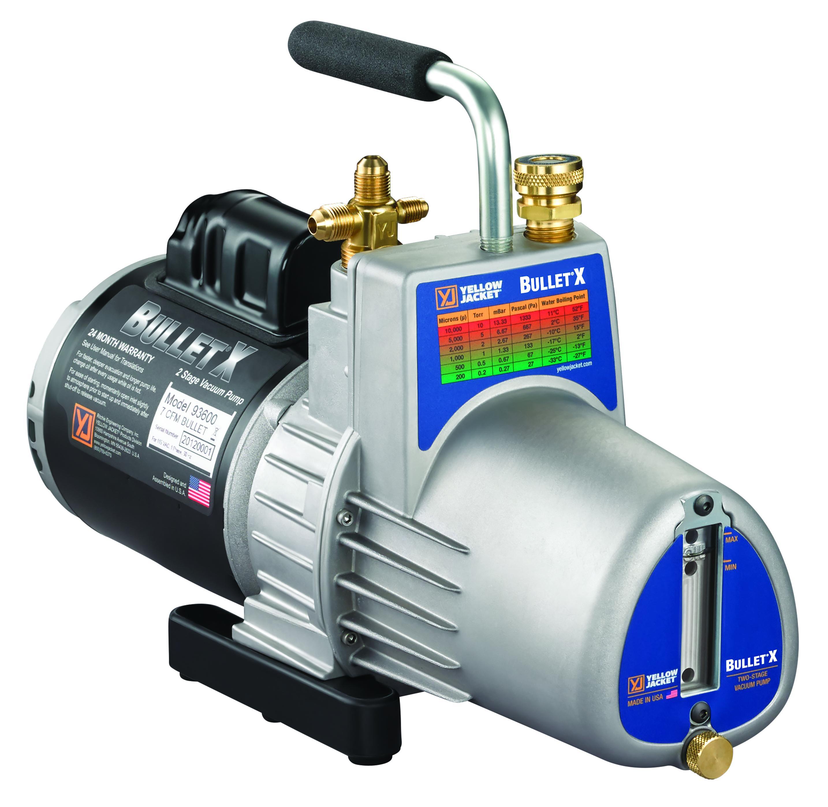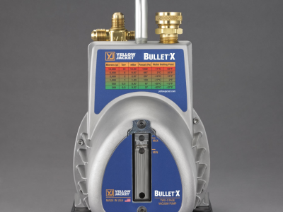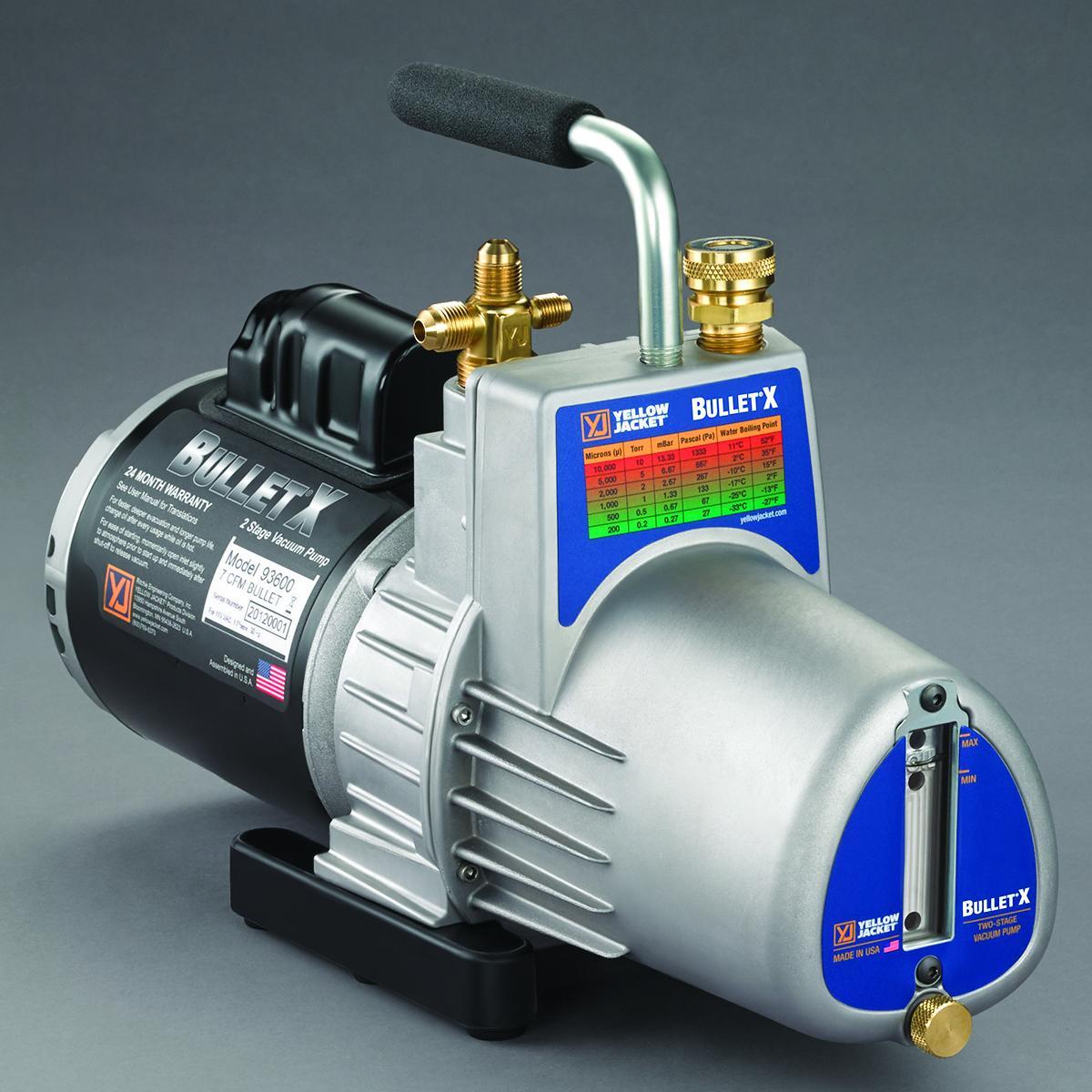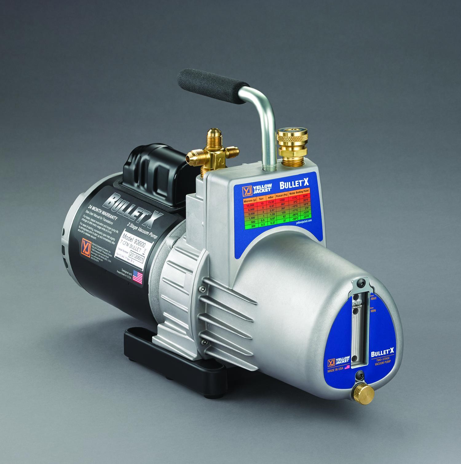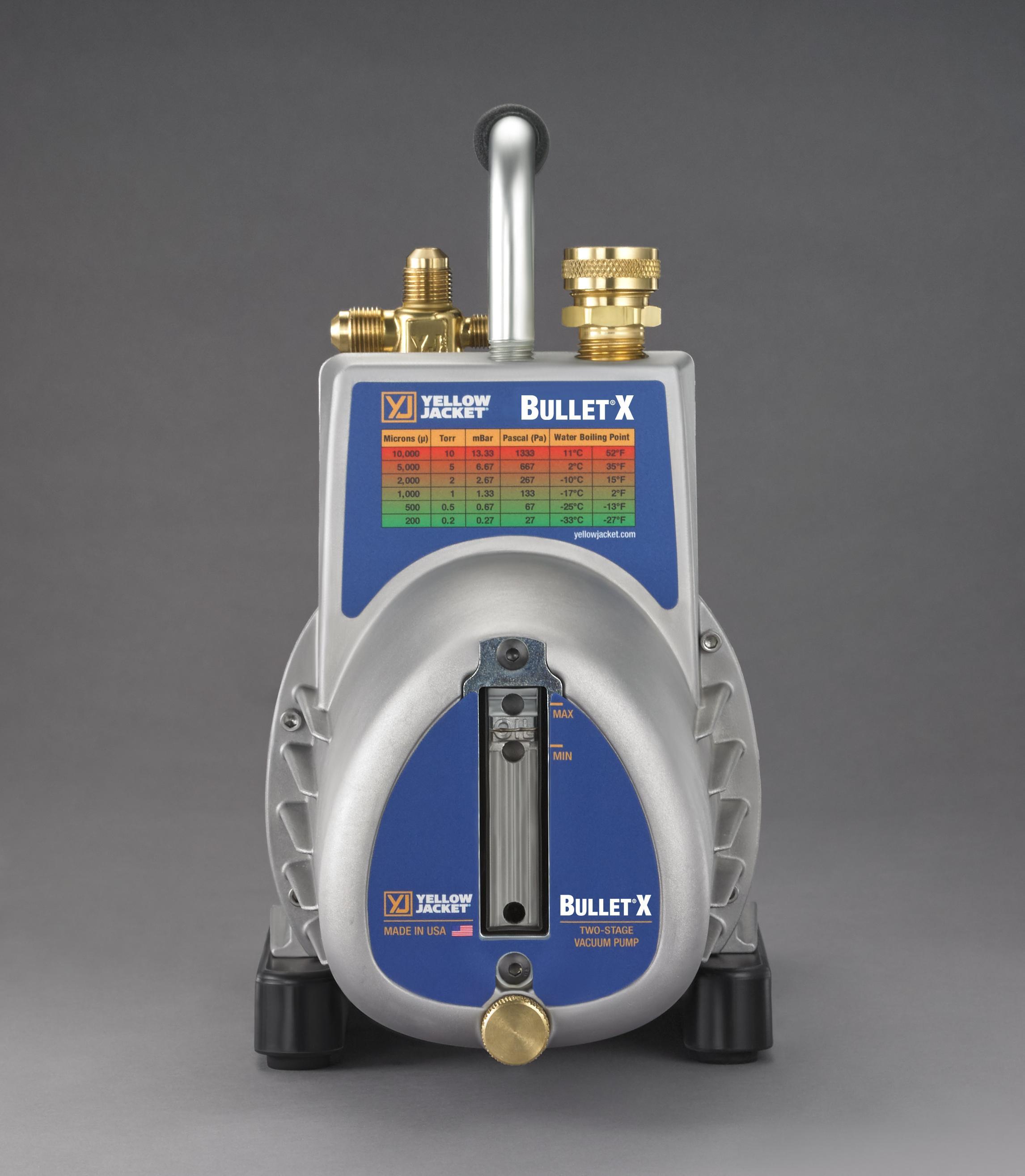 The YELLOW JACKET BULLET vacuum pump is an affordable option for HVAC technicians who know the importance of pulling a deep vacuum. The BULLET pulls down to 25 microns or better, protecting from contaminants and noncondensable gases in the HVAC system, which can damage components, reduce efficiency and cause system failure.