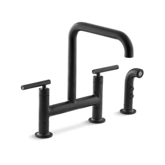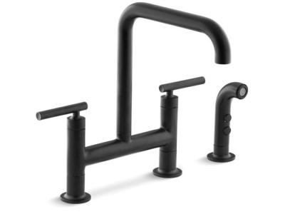 Kohler® Bridge Kitchen Sink Faucet, Purist®, 1.8 gpm, 8 in Center Distance, High-Arc Spout, 8-3/8 in Spout Reach, 10 in Spout Height, Lever, 2 Handles, Side Spray(Y/N): Yes, 3 Faucet Holes, 3/8 in, Compression, 2-1/2 in Maximum Deck Thickness, Deck Mount, Ceramic Disc Valve/Cartridge, 12-1/2 in H, Metal, Matte Black