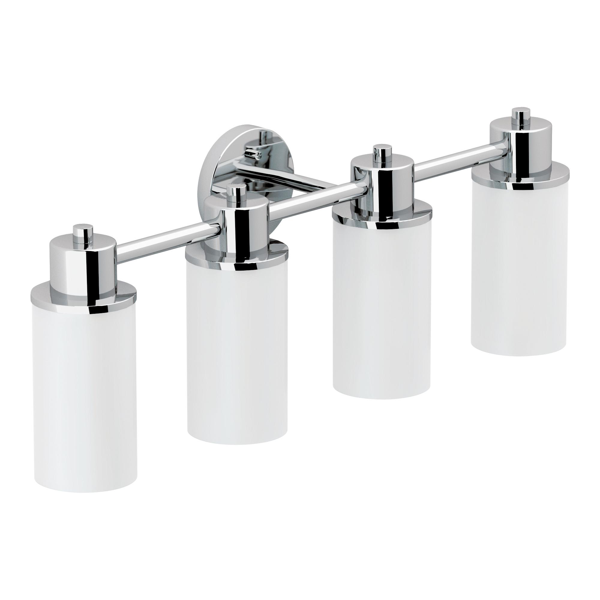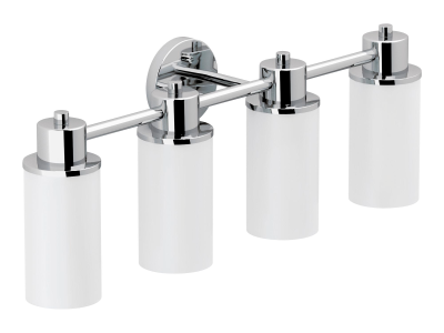Moen® 4-Globe Bath Light, Iso™, 120 VAC, Medium Lamp Base Type, 100 W Lamp, Glass/Zinc Housing, Polished Chrome Housing, 29.02 in W x 5.97 in D x 11.02 in H, Import