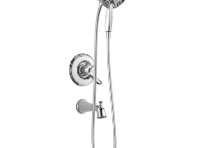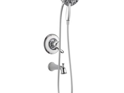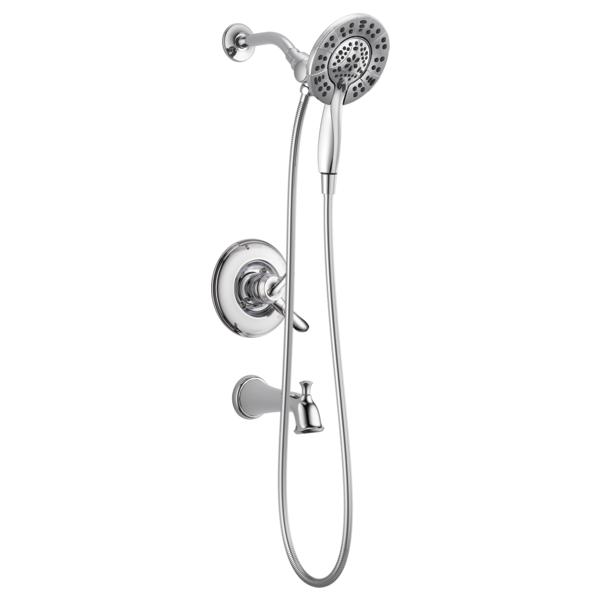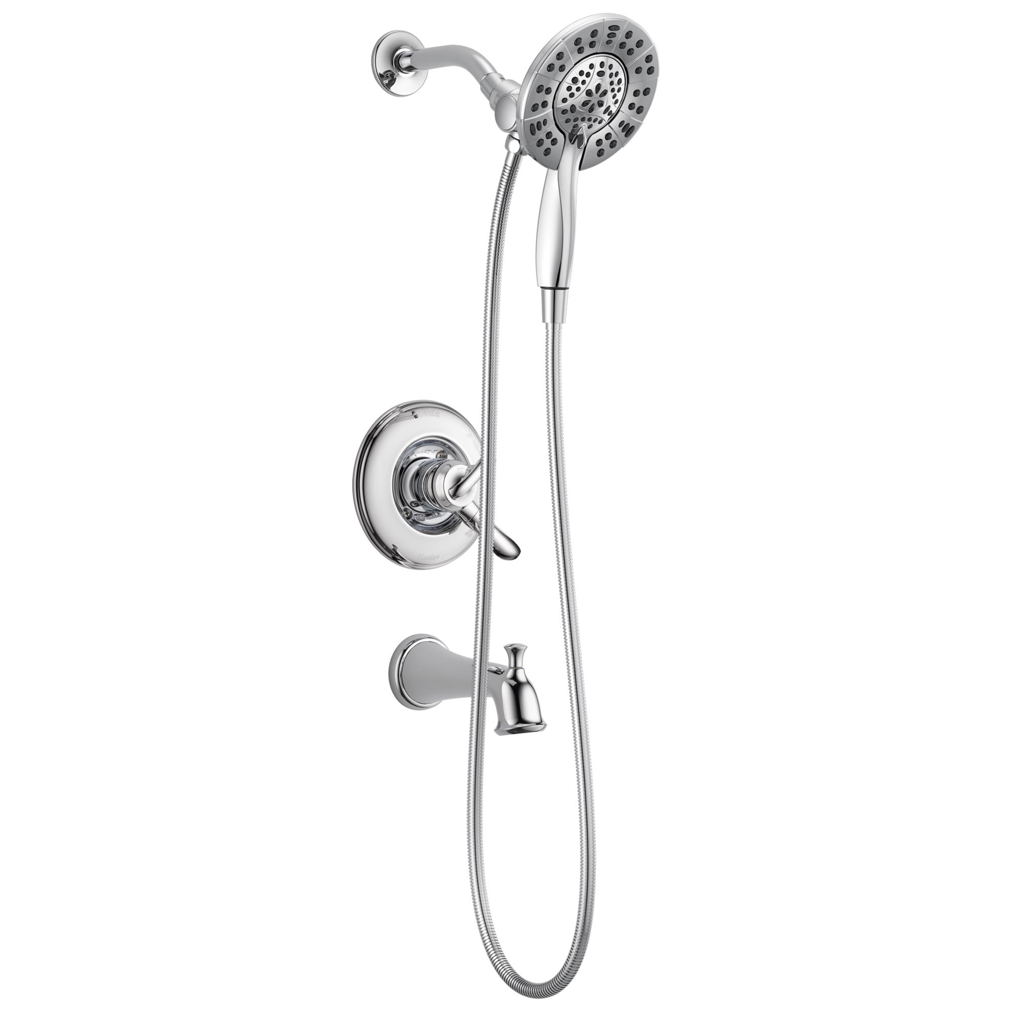 DELTA® Shower Trim, Series: Monitor® 17, Linden™ Collection, 2 gpm Shower Flow Rate, Pull-Up Diverter Spout, 6-1/2 in Spout Reach, Metal Lever Handle, 1222 Pressure Balanced, Hand Shower: Yes, 69 in L Hose, Spray Pattern: Full Body/Fast Massage/Full Body with Massage/Pause, 4 Spray Functions, Wall Mounting, Solid Brass, Polished Chrome, Domestic