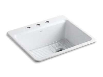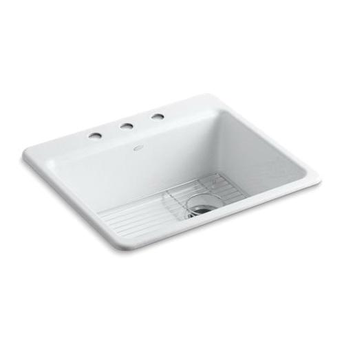 Kohler®, 5872-3A1-0, Kitchen Sink, Riverby® Collection, Rectangular Shape, 22-1/4 in Bowl Length, 15-13/16 in Bowl Width, 9 in Bowl Depth, 3-7/8 in Drain Opening, 3 Faucet Holes, 4 in Faucet Hole Spacing, 1 Bowls, 25 in L x 22 in W x 9-5/8 in H Overall, Top Mounting, Enameled Cast Iron, White