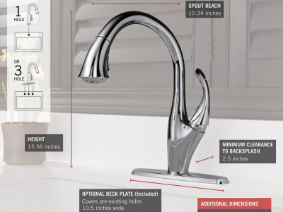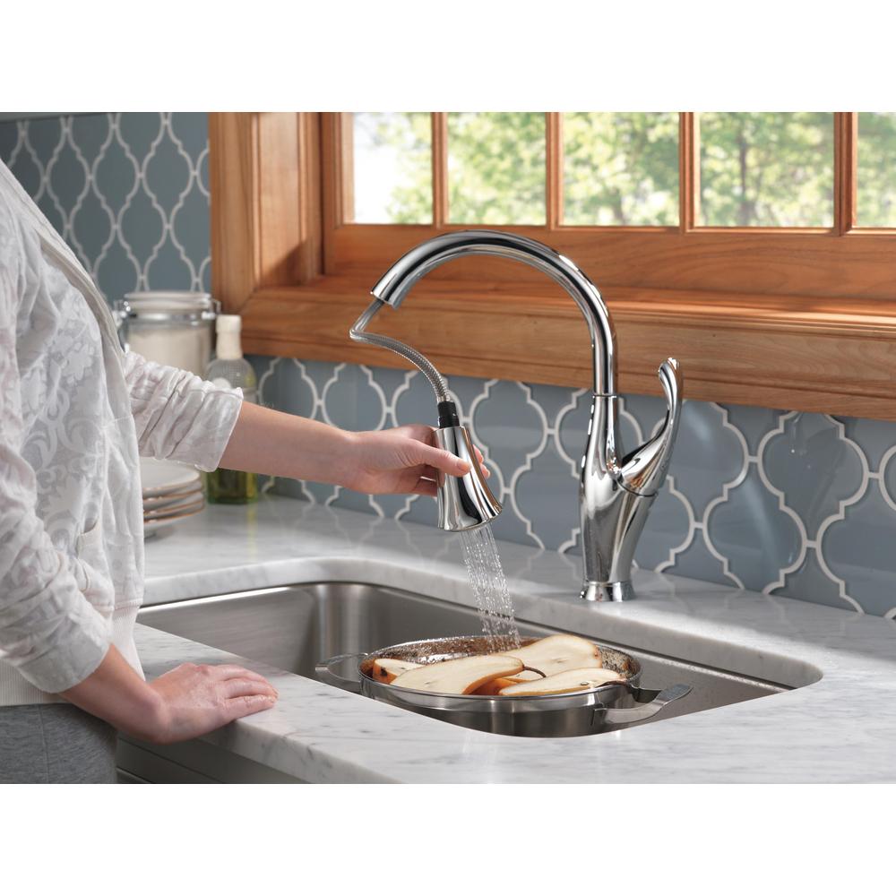 DELTA® Kitchen Faucet, Addison™ Collection, 1.5 gpm Flow Rate, 8 in Center Distance, Pull-Down Spout, 10-11/32 in Spout Reach, 15-9/16 in Spout Height, 62 in Hose, Lever Handle, 1 Handles, 1 Faucet Holes, 1-3/8 in Faucet Hole, 3/8 in Connection, Compression Connection, Spray Pattern: Aerated Stream/Full Body, Function: Traditional, 2 Spray Functions, 2-1/2 in Maximum Deck Thickness, Deck Mounting, Euro-Motion DIAMOND™ Seal Valve, Zinc, Polished Chrome, Domestic, Commercial Commercial/Residential
