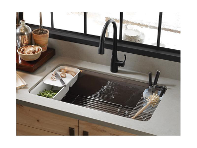 Simplify cleanup and customize your kitchen workspace with this KOHLER® Riverby stainless-steel utility rack. Custom-fit for select Riverby kitchen sinks, the rack is ideal for drying items and keeping sponges and other tools organized and out of the way. This includes a removable soaking cup for utensils.