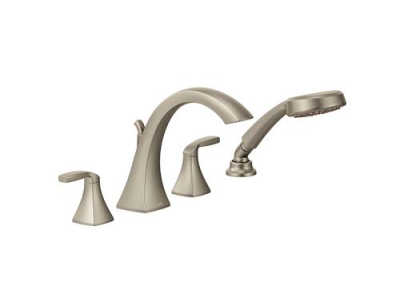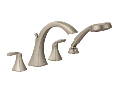 Crisp edges and uncomplicated style features give the Voss collection an ageless, yet fashion-forward, presence. Each silhouette brings a confident transitional style to the bath. This brushed nickel two-handle high arc roman tub faucet includes hand shower was built to last by MOEN. Designed for use in your bath. This trim kit requires MOEN valve 9792, 9793, 9796, or 9797 to complete installation.
