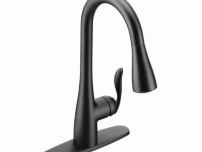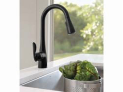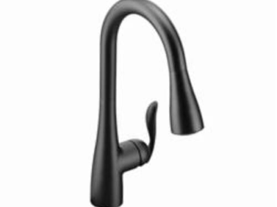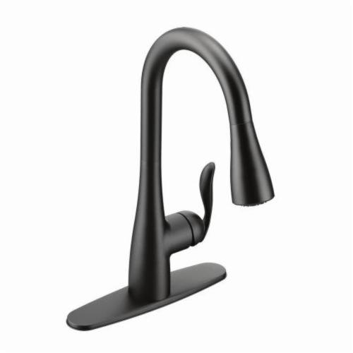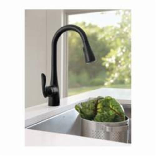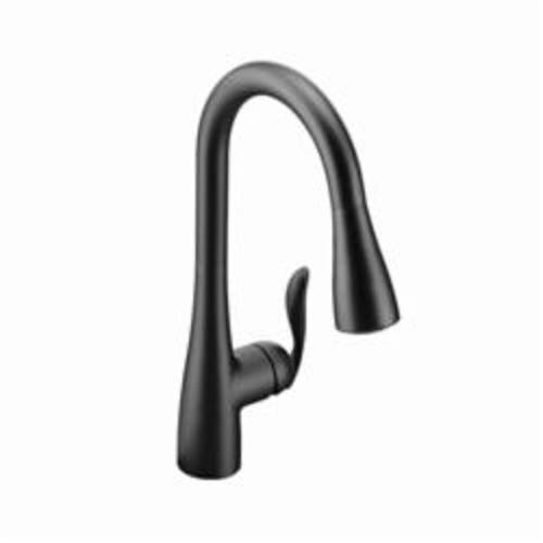 Moen®, 7594BL, Kitchen Faucet, Arbor® Collection, 1.5 gpm Flow Rate, High Arc Pull-Down Spout, 7.87 in Spout Reach, 15-1/2 in Spout Height, 68 in Hose, Lever Handle, 1 Handles, 1/3 Faucet Holes, 1-1/2 in Faucet Hole, 3/8 in Connection, Compression Connection, Spray Pattern: Aerated Stream, Function: Traditional, 3 Spray Functions, 2-1/2 in Maximum Deck Thickness, Deck Mounting, 1255 Duralast® Ceramic Disc, 10.25 in W x 7.88 in D x 15.5 in H Dimensions, Metal, Matte Black, Domestic