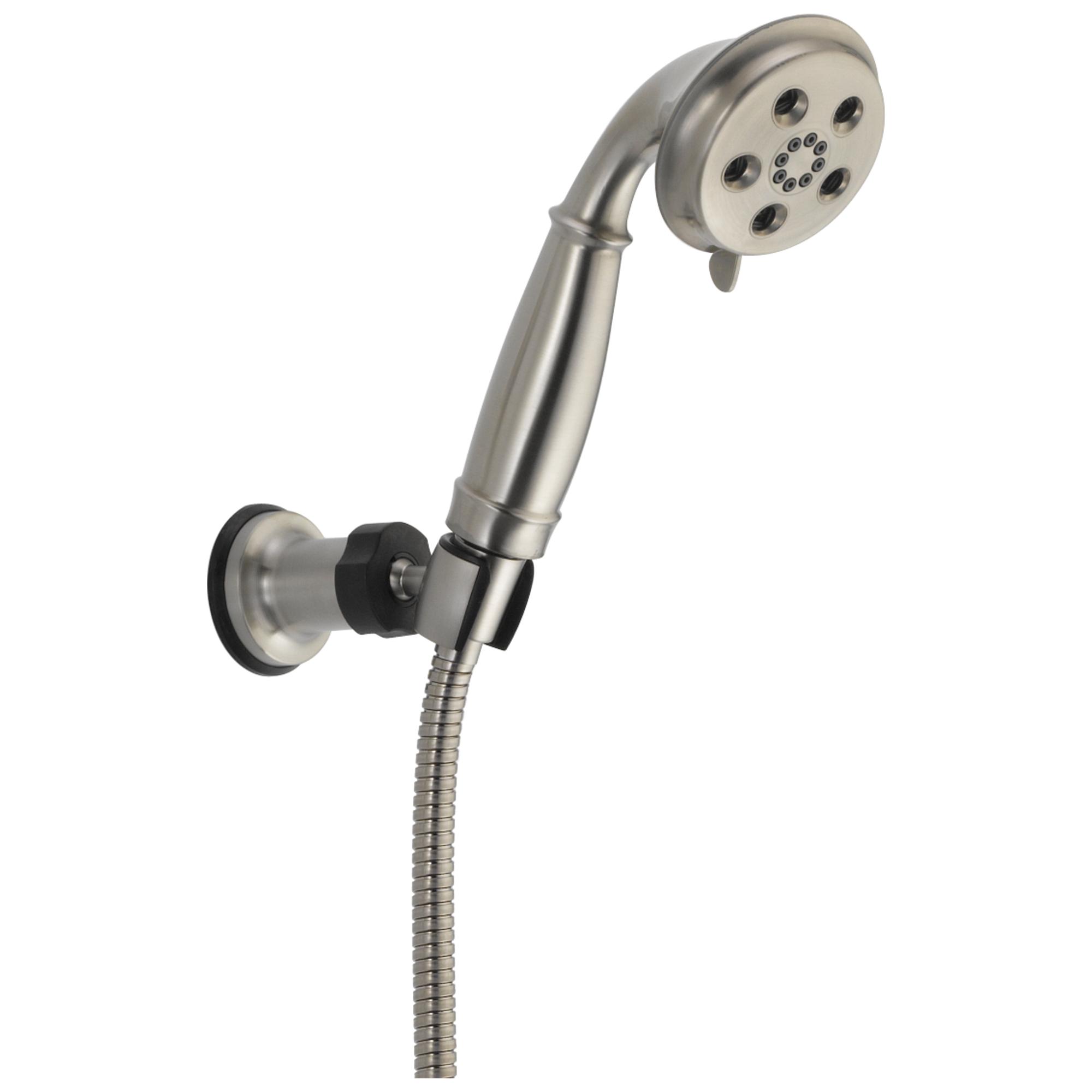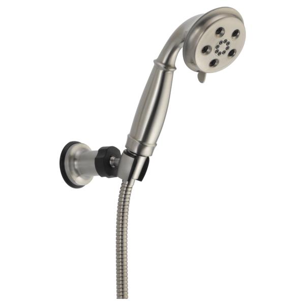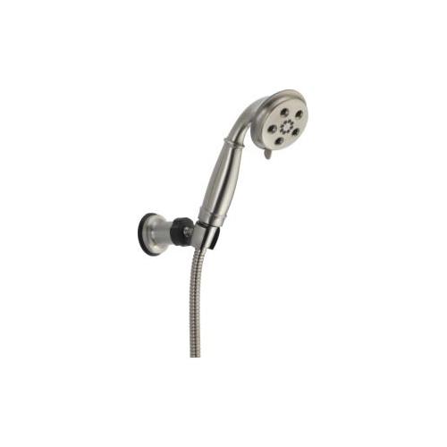 DELTA® Wall Mount Hand Shower, 3 in Shower Head Diameter, 3-Function Shower Head Patterns, 1.75 gpm Flow Rate, 60 in Hose Length, H2Okinetic®/Massage/Pause Spray, Slide Bar Holder, 80 psi Pressure, 1/2 in Connection, Metal Hose, Brass, Stainless Steel, 4 in D x 9-5/16 in H Dimensions, Import