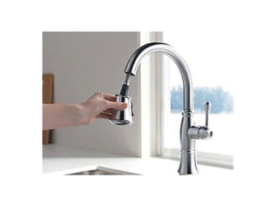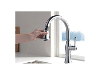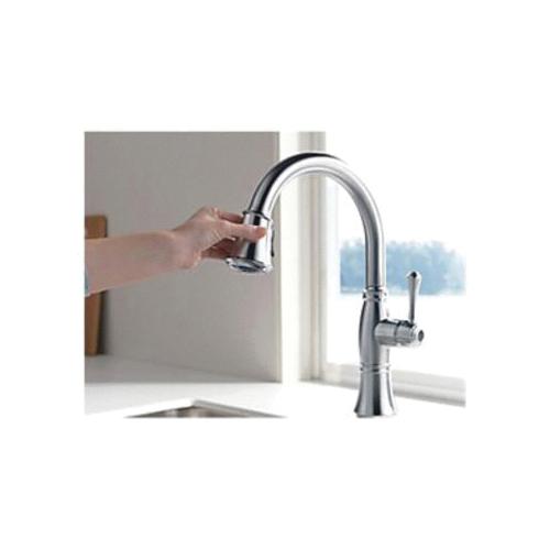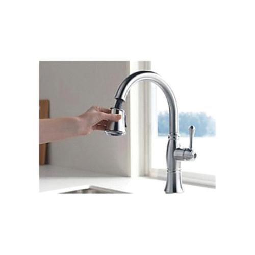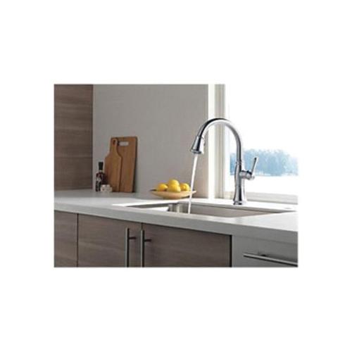 Kitchen sink faucets with Touch-Clean® Spray Holes allow you to easily wipe away calcium and lime build-up with the touch of a finger. Delta® ShieldSpray® Technology cleans with laser-like precision while containing mess and splatter. A concentrated jet powers away stubborn messes while an innovative shield of water contains splatter and clears off the mess, so you can spend less time soaking, scrubbing and shirt swapping. Delta® Lumicoat™ Finishes easily wipe clean without the need for cleaners or chemicals and are guaranteed to resist mineral buildup and hard water stains. The ultra-sleek surface repels liquids, resisting water spots and staying cleaner longer, so your faucet stays beautiful. Delta® kitchen faucets with DIAMOND™ Seal Technology perform like new for life with a patented design which reduces leak points, is less hassle to install and lasts twice as long as the industry standard*. Kitchen sink faucets with Touch-Clean® Spray Holes allow you to easily wipe away calcium and lime build-up with the touch of a finger. You can install with confidence, knowing that Delta faucets are backed by our Lifetime Limited Warranty. *Industry standard is based on ASME A112.18.1 of 500,000 cycles.