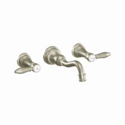 Moen® Bathroom Faucet, Series: TS42106, Weymouth™ Collection, 1.2 to 1.5 gpm Flow Rate, 8 in Center Distance, Fixed Spout, 7.84 in Spout Reach, 5-1/4 in Spout Height, Lever Handle, 2 Handles, Pop-Up Drain, 3 Faucet Holes, 1/2 in Connection, C Connection, Function: Traditional, Wall Mounting, 1224 Ceramic Disc Cartridge, 8 in W x 9 in D x 6 in H Dimensions, Metal, Brushed Nickel, Domestic